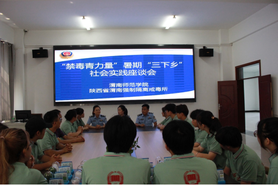 随后,实践队员通过现场观摩禁毒宣传展板、仿真毒品模型、互动体验设施、“四区五中心”等生动直观的了解到识毒、防毒、禁毒、戒毒全过程。还展示了“青春护航,拒让毒来”文创产品、模拟实验、宣传海报、漫画手册、科普视频等原创性成果。双方在禁毒宣传的创新形式和丰富载体等方面进行交流研讨学习,陕西省渭南强制隔离戒毒所干警对师生们原创性成果给予肯定并提出专业性指导意见。