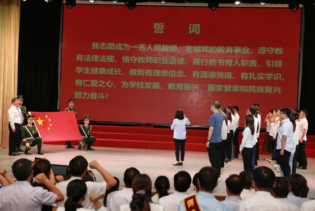 校领导为2024年新入职教师代表佩戴校徽。卓宇监誓,副校长王菊霞领誓,全体新入职教师庄严宣誓,“我志愿成为一名人民教师,忠诚党的教育事业,遵守教育法律法规……”铿锵誓言响彻会场。