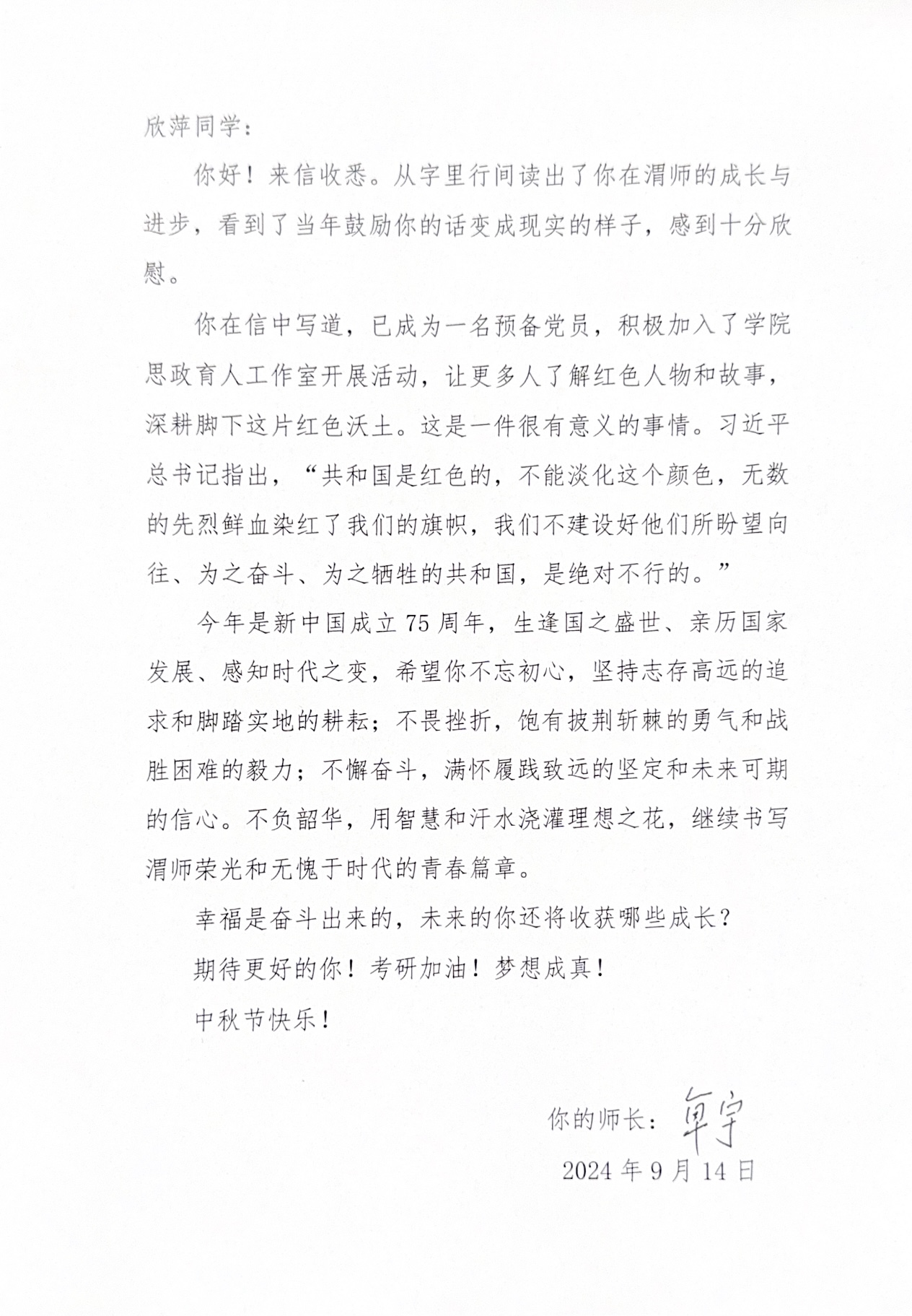 马欣萍的这封信是渭师学子奋斗成长的缩影,实实在在地记录着在这座学校教育事业发展的背后,那如春风化雨般的师生情谊。(通讯员 雷岩 姜雨青 审核人 韩城忠)