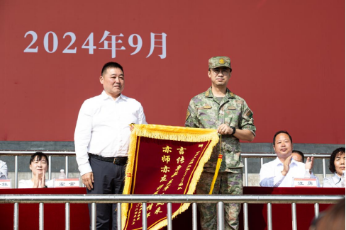 卓宇为承训部队中国人民解放军63762部队赠送锦旗,感谢部队教官在军训过程中“言传身教显军人风采,亦师亦友抒家国情怀”的辛勤付出。