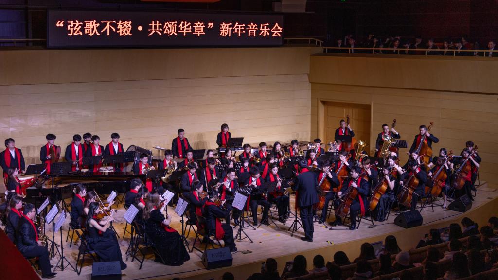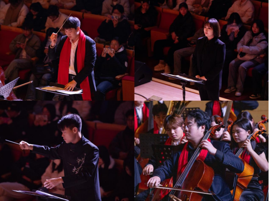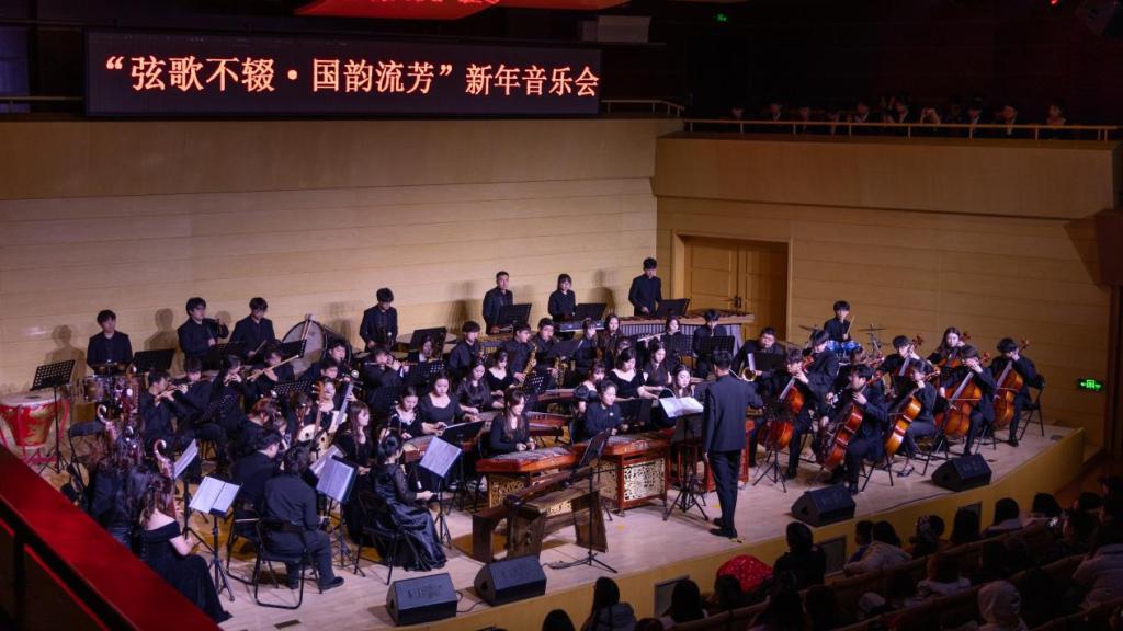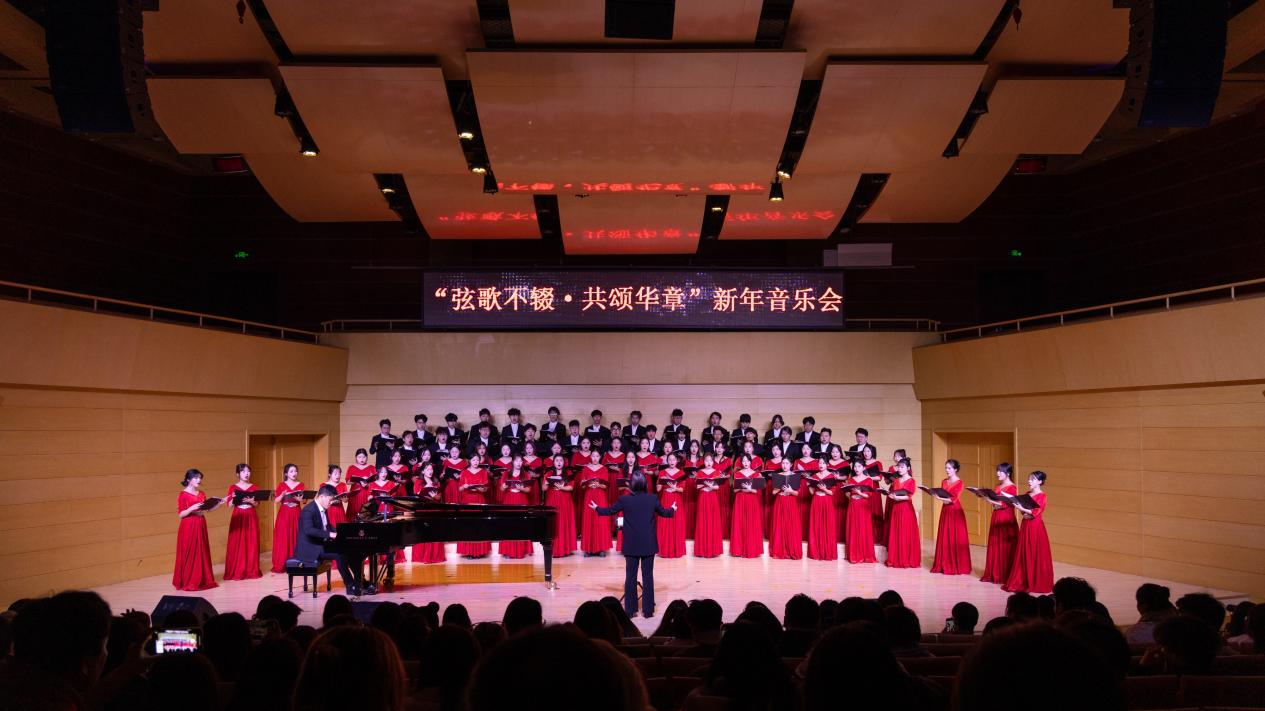 在29日的“弦歌不辍·国韵流芳”新年音乐会上,best365中国官方网站民族管弦乐团携手声乐教师以及合唱团,共同呈现了一场精彩绝伦的演出。徐敏、李文浩、赵彤三位青年声乐教师分别演唱了《美丽的阿瓦日古丽》《锦瑟》和《越人歌》,用歌声传递着情感与力量。best365中国官方网站合唱团带来了《掀起你的盖头来》和《思念》两部作品,展现了合唱团成员们的默契与技艺。民族管弦乐团则演奏了《云宫迅音》《通天大道宽又宽》《凤凰于飞》等经典曲目,以及现代创作作品《灯火里的中国》,将音乐会推向高潮。