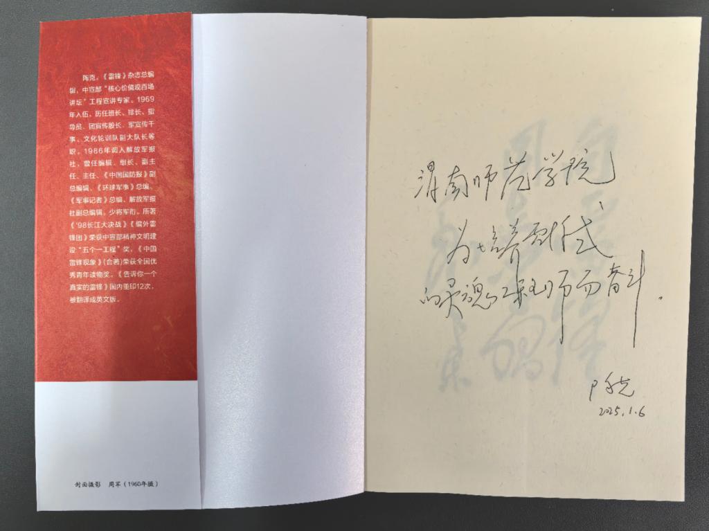 电影结束后,陶克少将一行为学校“学雷锋志愿服务队”授旗,与志愿队队员进行了亲切交流,勉励师生“雷锋精神,人人可学;奉献爱心,处处可为”,并寄语学校“为培养雷锋式的灵魂工程师而奋斗”。