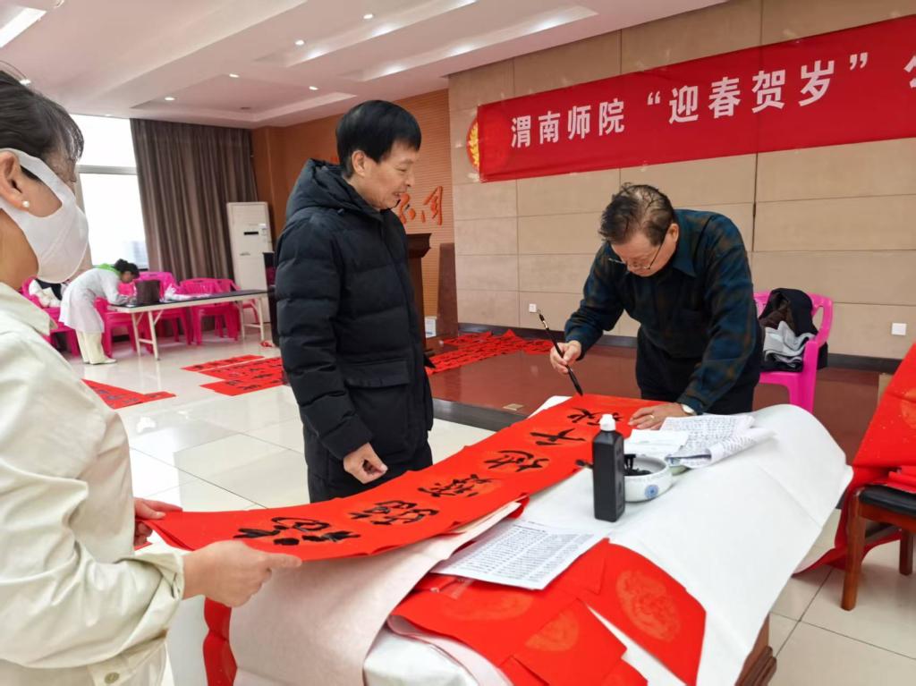 翰墨飘香贺新岁,春联送福启新程。1月22日,由校工会、渭南市书画协会举办的“迎春贺岁送春联”活动在朝阳校区职工之家举行,校内书法家、书法爱好者挥毫泼墨,笔走龙蛇,大家齐聚一堂向全校教职工送上新春祝福。