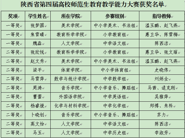 近日,陕西省第四届高校师范生教育教学能力大赛决赛成绩揭晓,best365共有13名师范生参加了语文、数学、英语、历史、化学、小学教育、美术书法、音乐舞蹈、体育等9个学科的省级决赛,最终获得一等奖3项、二等奖10项。