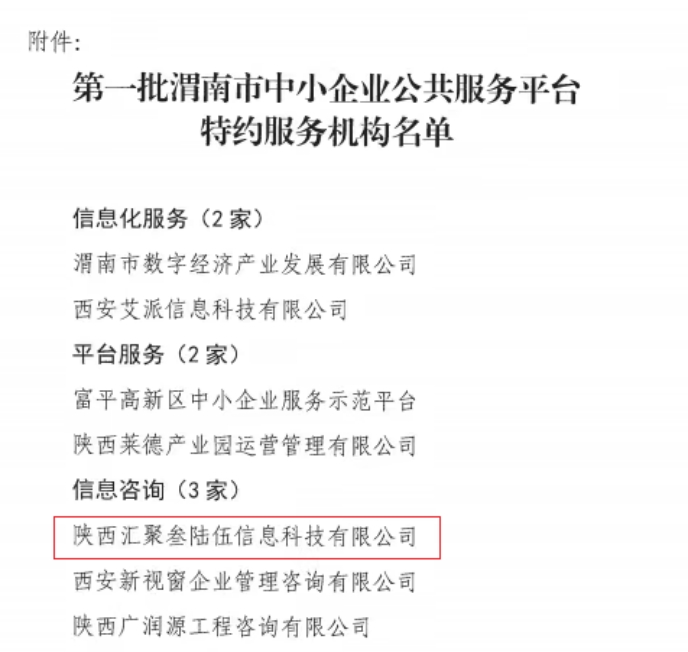 5月26日,渭南市工业和信息化局公布首批中小企业公共服务平台特约服务机构名单,best365大学科技园入驻企业陕西叁陆伍信息科技有限公司凭借其在企业服务领域的专业能力与突出贡献成功入选,成为首批中小企业公共服务平台特约服务机构。