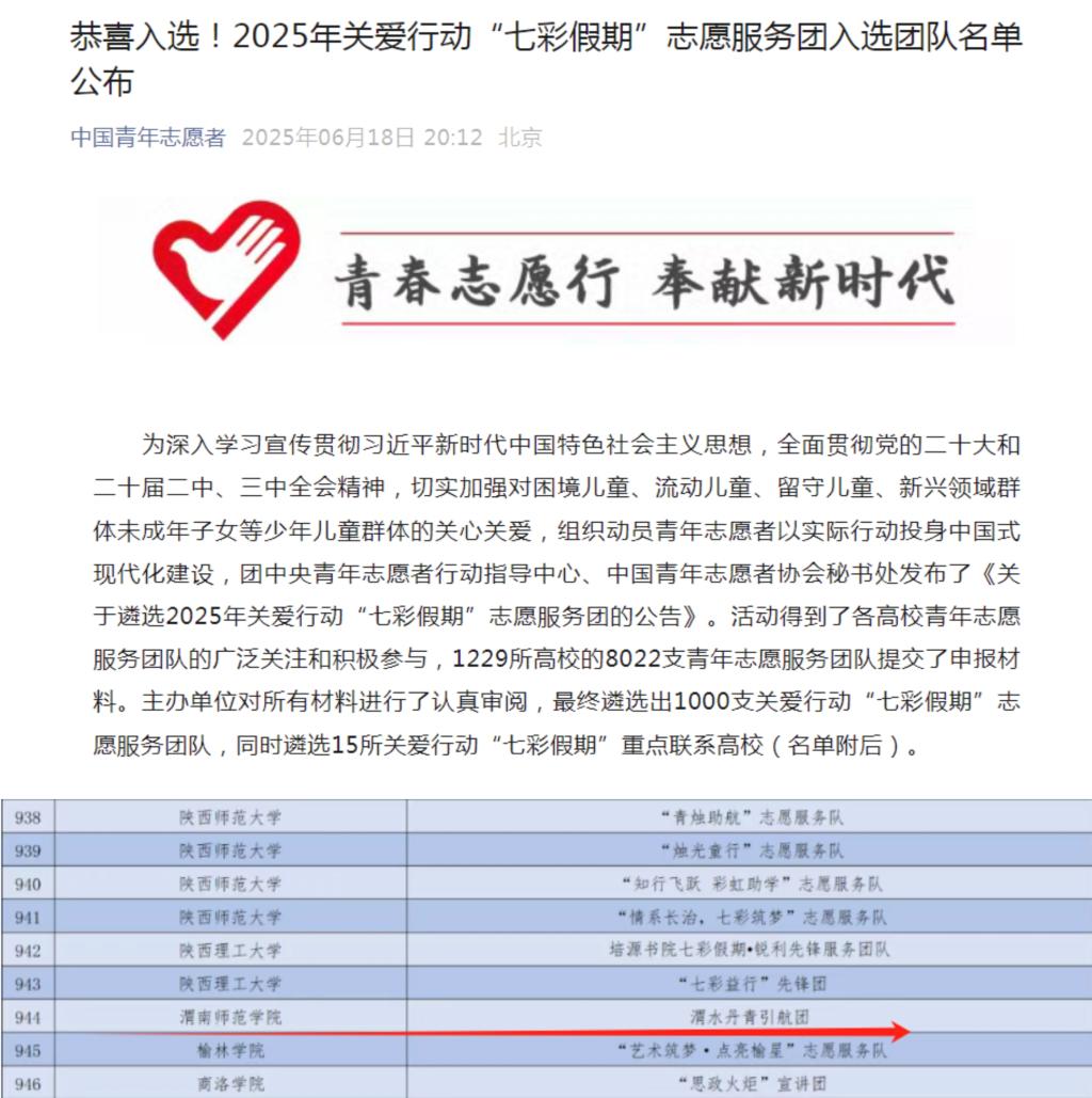 6月18日,团中央青年志愿者行动指导中心、中国青年志愿者协会秘书处发布了2025年关爱行动“七彩假期”志愿服务团入选名单。best365“渭水丹青引航团”项目,从全国1229所高校的8022支团队中脱颖而出,成功入选国家级志愿服务团队。
