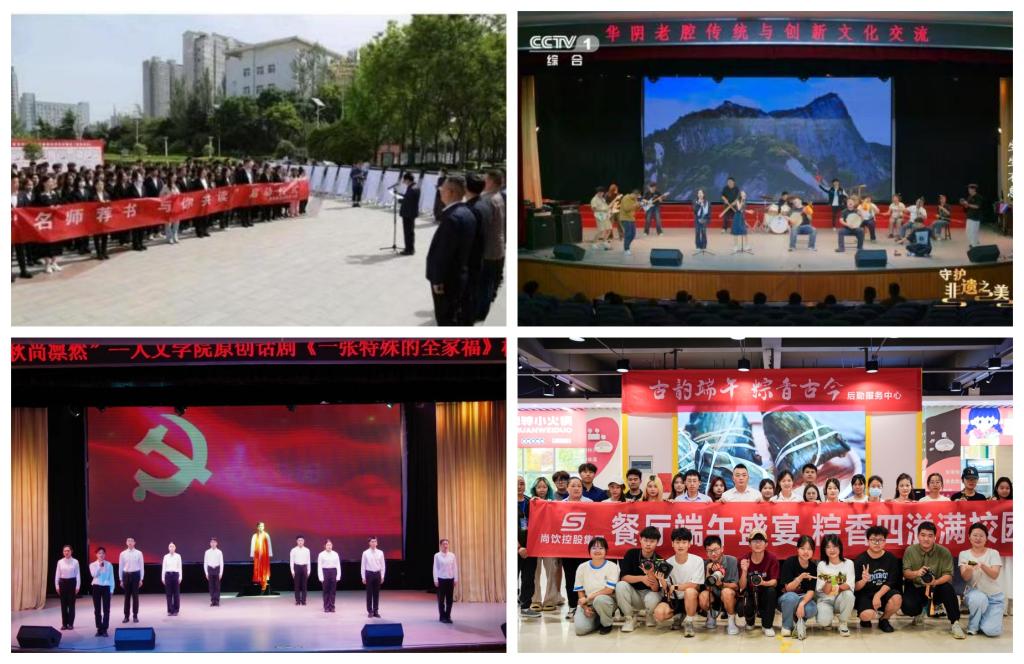 把文化育人理念和元素通过校园景观、宣传栏、主题活动、艺术创作、文艺展演等形式表现出来,使师生在充满主流价值观的文化环境中滋养理想信念、厚植家国情怀。组织开展“礼敬中华优秀传统文化”“我们的节日”、全民阅读等活动,大学生老腔艺术团亮相央视综合频道(CCTV-1)纪录片《守护非遗之美》,师生手绘实践助力乡村文化建设、科普推广进社区、春节义务写对联等活动社会反响良好。