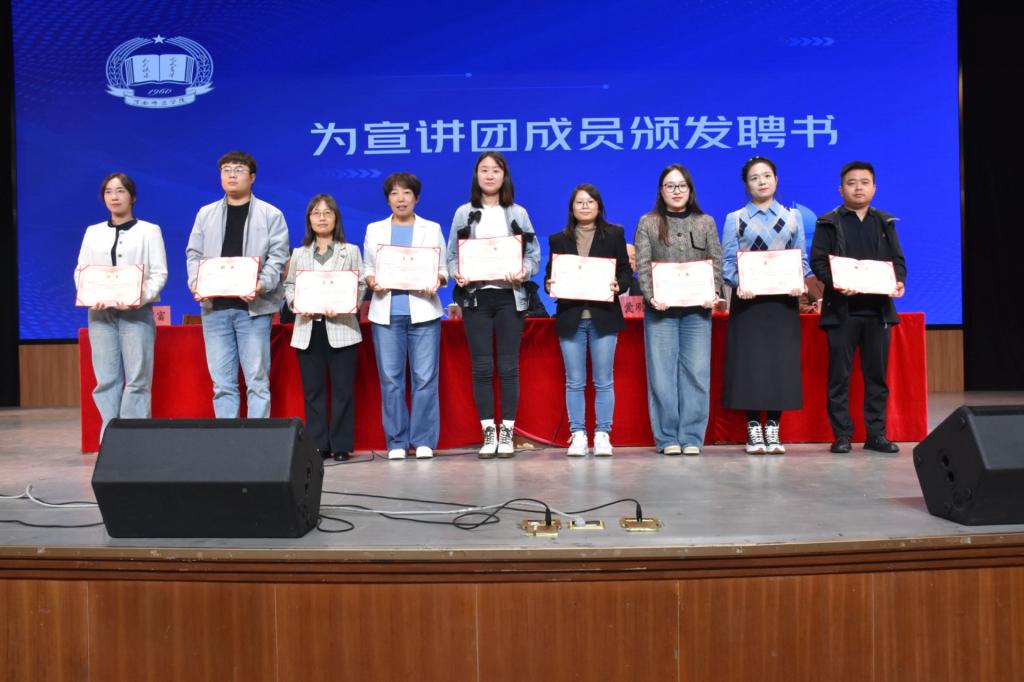 王磊宣读了关于认定渭师科普宣讲团为“渭南市科普宣讲团”的批复文件。李延潮与卢爱刚共同为宣讲团揭牌。并向王志平、王艳丽等9位教师颁发了首批宣讲团成员聘书。