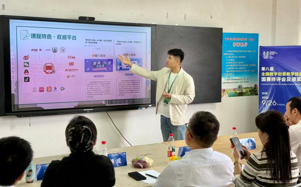 决赛现场,于占豪以“视听短片创作技巧”为知识点进行了讲授,围绕专业能力培养与价值引领双向赋能,融入课程思政、社会课堂、数字应用、教学展演等四大教学创新点,同时对课程建设与实际教学中的育人目标、技能训练、实践平台、情感教育等多个特色进行了展示,赢得在场评审的一致认可。