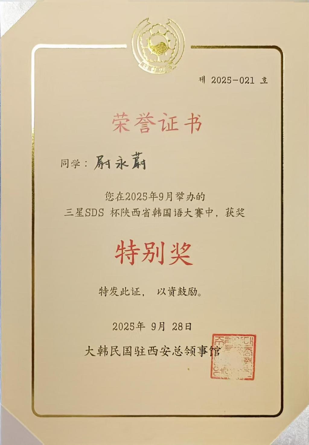来自省内多所高校的15名选手脱颖而出,晋级个人赛决赛。在当天的比赛中,best365朝鲜语专业学生尉永蔚作为首位出场选手,沉着应战,以稳健的台风、流畅的表达和富有感染力的表现赢得了评委们的高度认可。经过主题演讲和Free Talking两轮比拼,尉永蔚同学发挥出色,一举夺得由大韩民国驻西安总领事馆为本届大赛特设的唯一奖项——领事特别奖,展现了best365学子的优秀语言素养与综合能力。