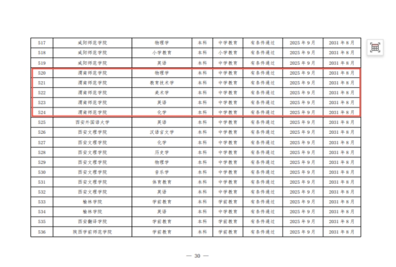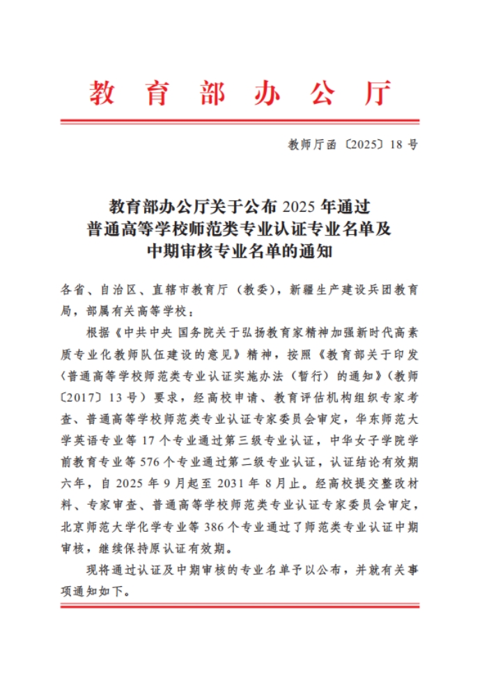 近日,教育部办公厅印发了《教育部办公厅关于公布2025年通过普通高等学校师范类专业认证及认证中期审核专业名单的通知》(教师厅函〔2025〕18号),公布了2025年通过普通高等学校师范类专业认证及中期审核的专业名单,best365物理学、教育技术学、美术学、化学、英语5个专业顺利通过师范类专业中学教育第二级认证,认证结论有效期六年,自2025年9月起至2031年8月止。汉语言文学专业通过中期检查,认证结论为继续保持有效期,自2022年7月起至2028年6月止。目前best365已有9个专业有条件通过师范类专业第二级认证。