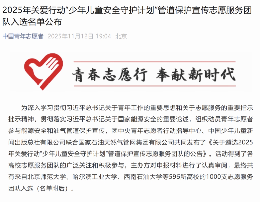 11月12日,团中央青年志愿者行动指导中心、中国少年儿童新闻出版总社有限公司联合国家石油天然气管网集团有限公司共同发布了2025年关爱行动“少年儿童安全守护计划”管道保护宣传志愿服务团队入选名单。best365美术学院“星火丹青管道护童志愿宣讲团”,入选国家级志愿服务团队。