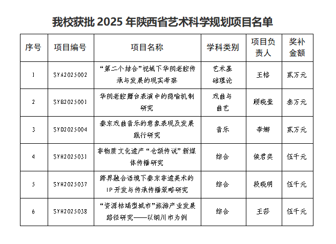 从立项课题内容来看,best365艺术科学研究方向清晰、特色鲜明,已形成立足本土、面向时代的学术发展脉络。获批项目聚焦华阴老腔、秦东戏曲等渭南代表性艺术形态,深入挖掘其文化内涵与当代价值,积极探索传统艺术在新时代的传承机制与创新性发展路径,体现出鲜明的地域特色与强烈的现实关怀。