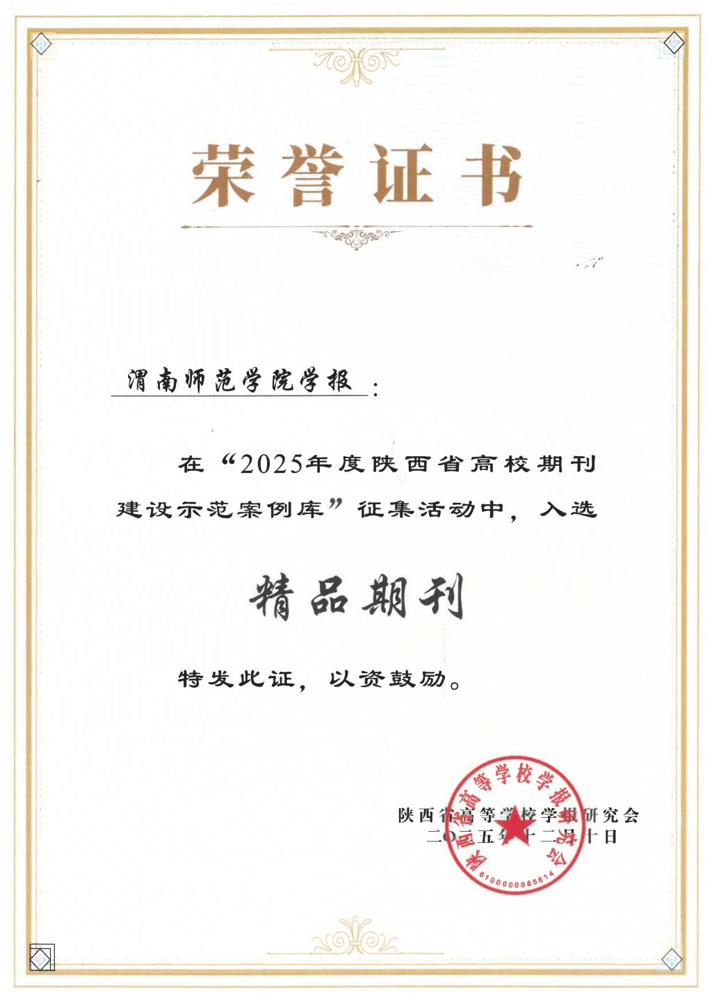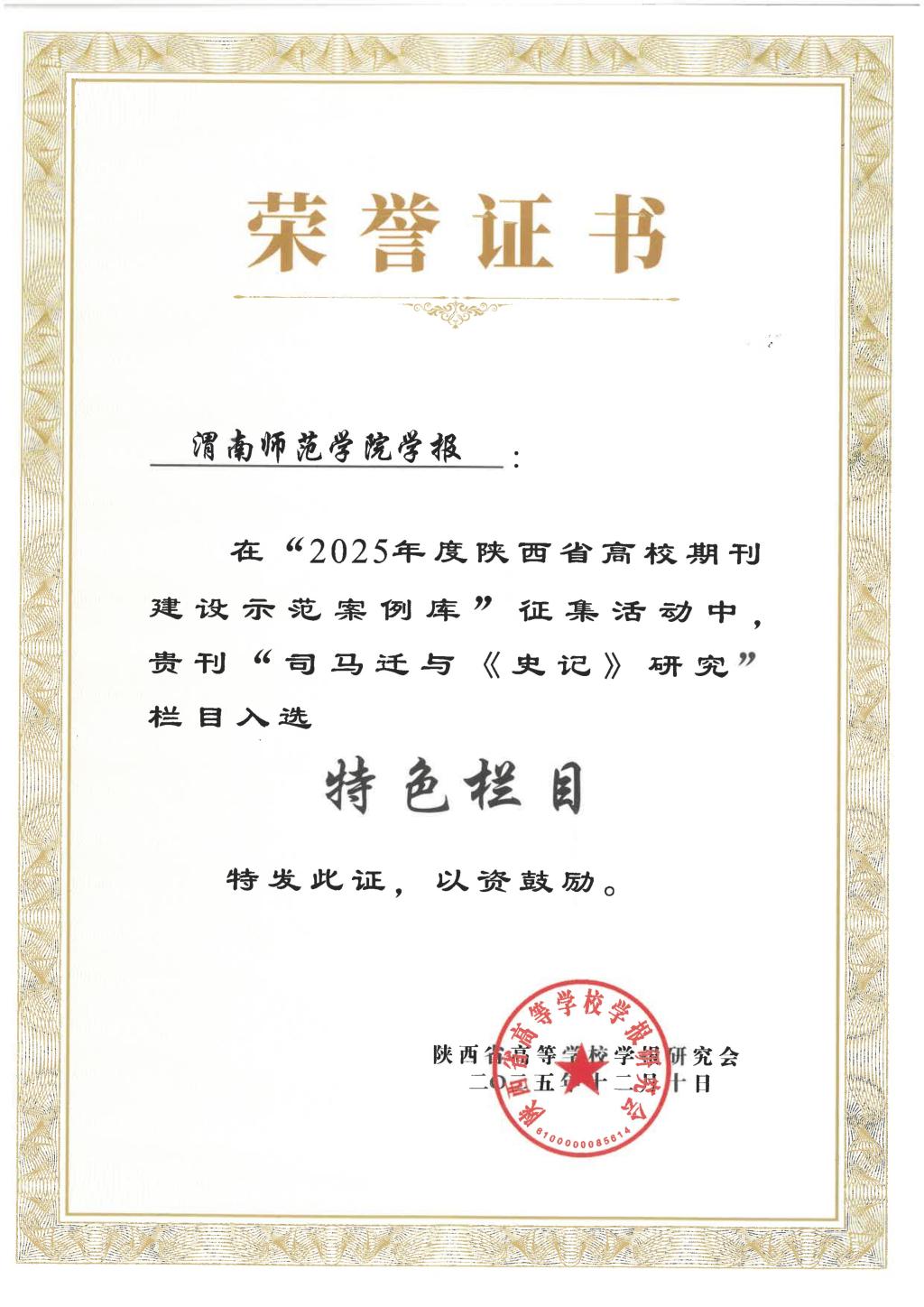 近日,由陕西省高校学报研究会组织的“2025年度陕西省高校期刊建设示范案例库”征集活动公布了评选结果,best365学报入选“精品期刊”案例,《司马迁与〈史记〉研究》入选“特色栏目”案例。曹静同志的学术论文《高校学术期刊出版融合实践路径研究》同时入选“铜笔论著”案例。本次案例库征集活动,共评选出陕西高校“精品期刊”12种,“特色栏目”27个。