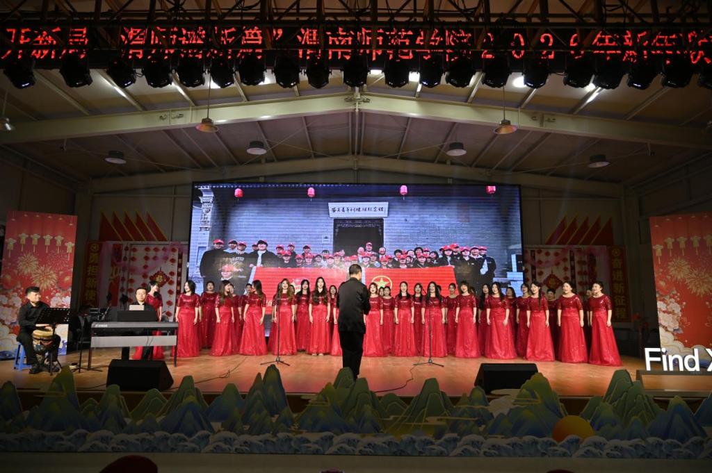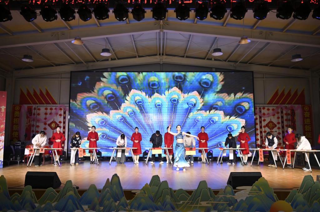 晚会上篇聚焦“同心筑基”,彰显渭师人凝心铸魂、筑牢根基的坚定信念。舞蹈《势不可挡》以动感舞步展现学生社团蓬勃发展的青春活力,诠释“五育并举”的育人成效;情景朗诵《再回延安》重现近300名师生搭乘红色专列奔赴革命圣地的“延安行”,将“行走的思政课”搬上舞台,重温初心信仰;歌曲《江山》深情礼赞学校65年来培养10万余名扎根基层的毕业生,传递一代代渭师人守护家国的赤子情怀;古筝重奏《踏雪归集》奏响千年清音与当代心律的共鸣;书法与舞蹈融合的《傣舞墨韵》则展现“各美其美,美美与共”的校园文化包容之姿,让传统与多元在舞台绽放光彩。