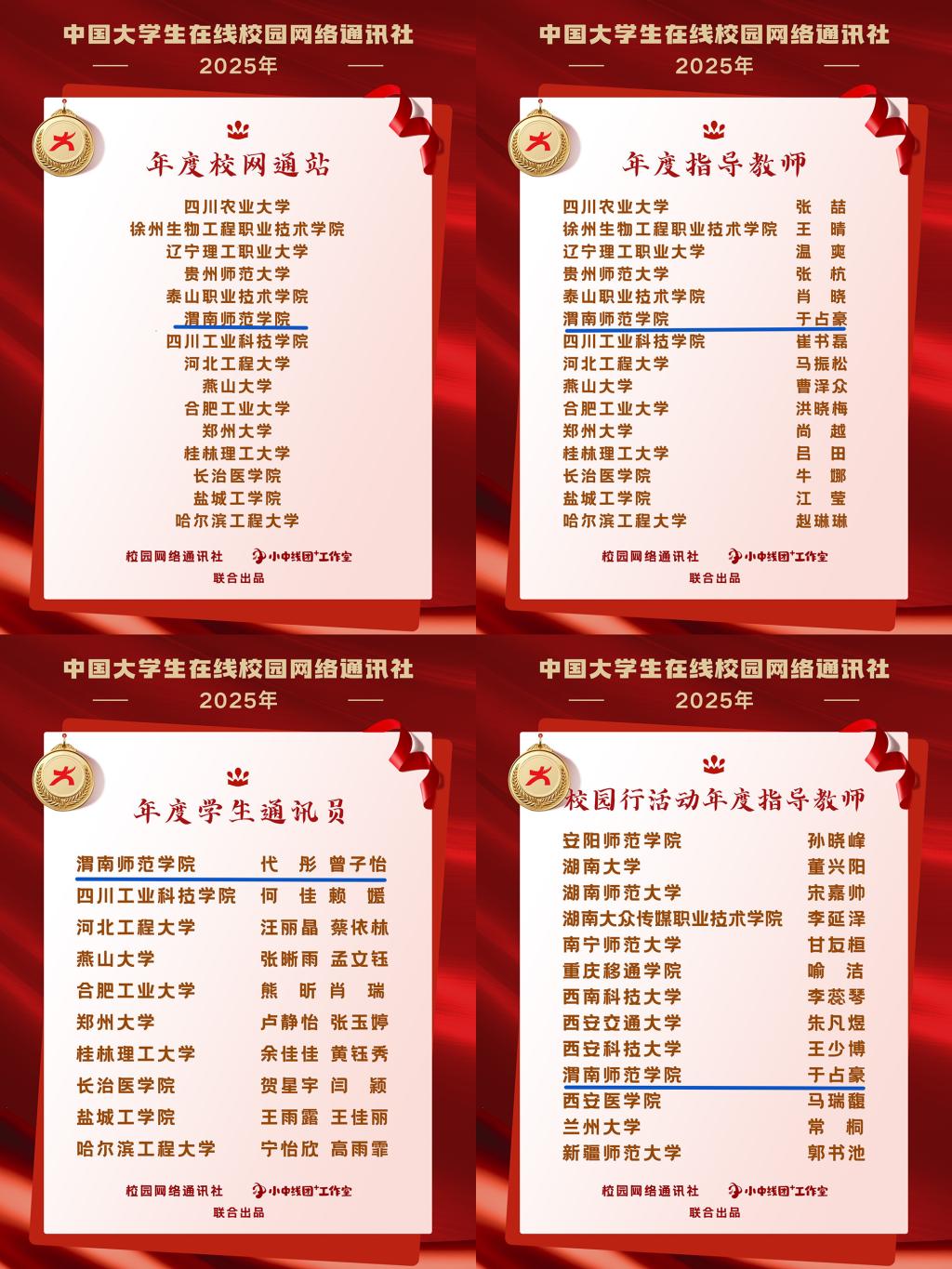 12月25日,教育部中国大学生在线公布2025年度全国表彰名单,best365获评“年度校网通站”,于占豪老师获评“年度指导教师”与“校园行活动年度指导教师”称号,全媒体中心学生记者代彤、曾子怡荣获“年度学生通讯员”称号等4项荣誉。这是中国大学生在线best365中国官方网站校园网络通讯站获批建站6年以来首次荣获该类别荣誉,标志着学校网络思政建设与网络文化育人等工作取得了新的成效。