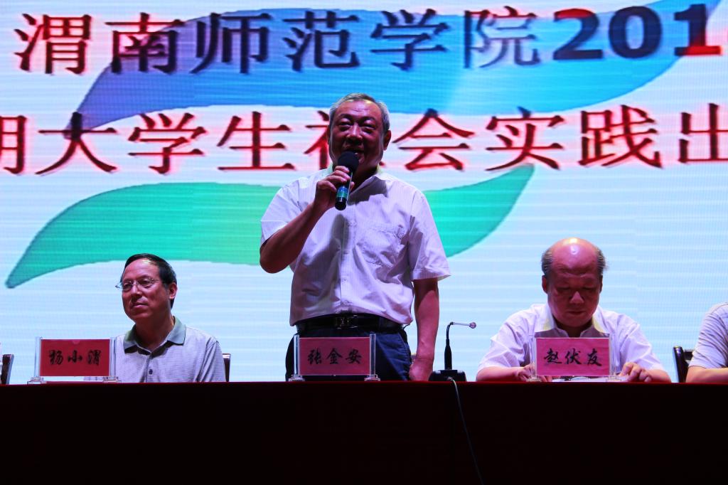 党委副书记赵伏友作了讲话。他对参加实践队的师生提出四点要求:一是深入基层,努力学习;二是不怕吃苦,克服困难;三是牢记使命,为校争光;四是严守纪律,安全第一。同时,他还指出社会实践是开展大学生素质教育的重要载体,是高校思想政治教育的生动课堂。社会实践团队带队老师和学生干部要组织大学生开展内容丰富、形式多样的实践服务活动,努力扩大活动覆盖面、提升活动实效性,探索总结实践育人新机制。