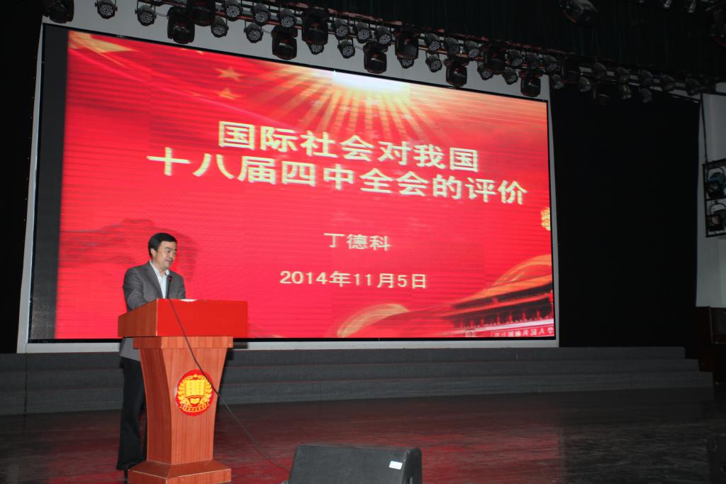 丁德科在题为《国际社会对我国十八届四中全会的评价》报告中,对党的十八届四中全会的新思想、新观点、新要求做了全面分析和深刻解读。通过回顾历届四中全会的讨论内容,详解十八届四中全会的主要内容和国际社会对十八届四中全会的关注、评价。