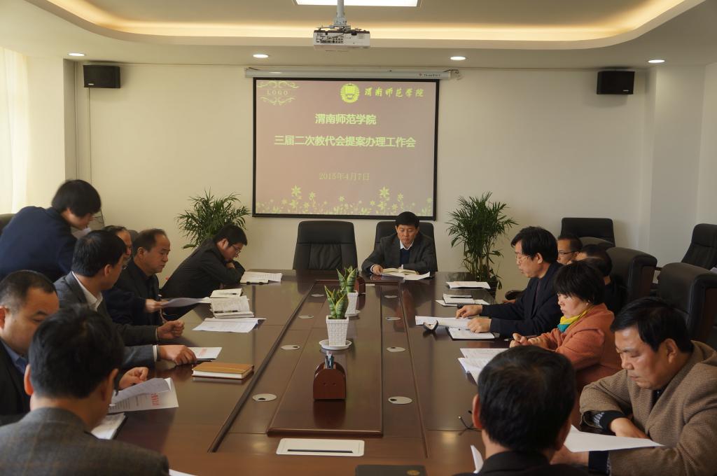 2015年4月7日上午,学校三届二次教代会提案办理工作会在厚德楼四楼会议室召开,校纪委书记、工会主席任健出席会议,校第三届提案工作委员会委员、涉及提案办理的主办、协办单位及校工会等职能部门负责人参加了会议。会议由校工会副主席王对启主持。