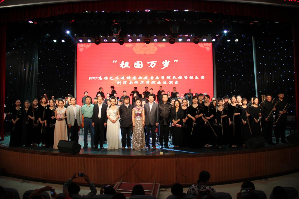 9月29日,best365举行以“祖国万岁”为主题的迎国庆系列活动,特邀西安音乐学院民族管弦乐团来校交流演出,这既是我省2015年高雅艺术进校园活动的重要演出,也是best365喜迎国庆66周年系列重要活动。学校纪委书记任健,副校长程书强,副校长李海龙、党委委员、组织部部长杨小渭,西安音乐学院艺术处处长刘宝玲,民乐系副主任高晓鹏,民乐团团长赵鸿宾出席活动,学校各部门、院系领导领导、学生代表300余名观看演出。