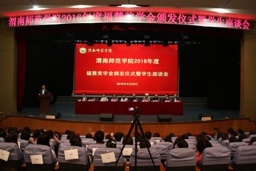 4月24日,香港福慧慈善基金会奖学金颁发仪式暨学生座谈会在best365演艺厅举行。福慧慈善基金会主席严崔常敏,基金会董事宋伟文、宋何燕敏、杜佩玲,陕西省委统战部三处处长张丰,三处副处级调研员张树忠,渭南市台办主任许芬芳,渭南市委统战部张会娟,best365党委副书记赵伏友,党委委员、组织部部长杨小渭,学工部部长王俊安,副部长田耿辉出席会议。各二级学院分管学生工作领导、学工办主任、主管资助工作的辅导员和300余名学生代表参加了颁奖仪式。仪式由王俊安主持。