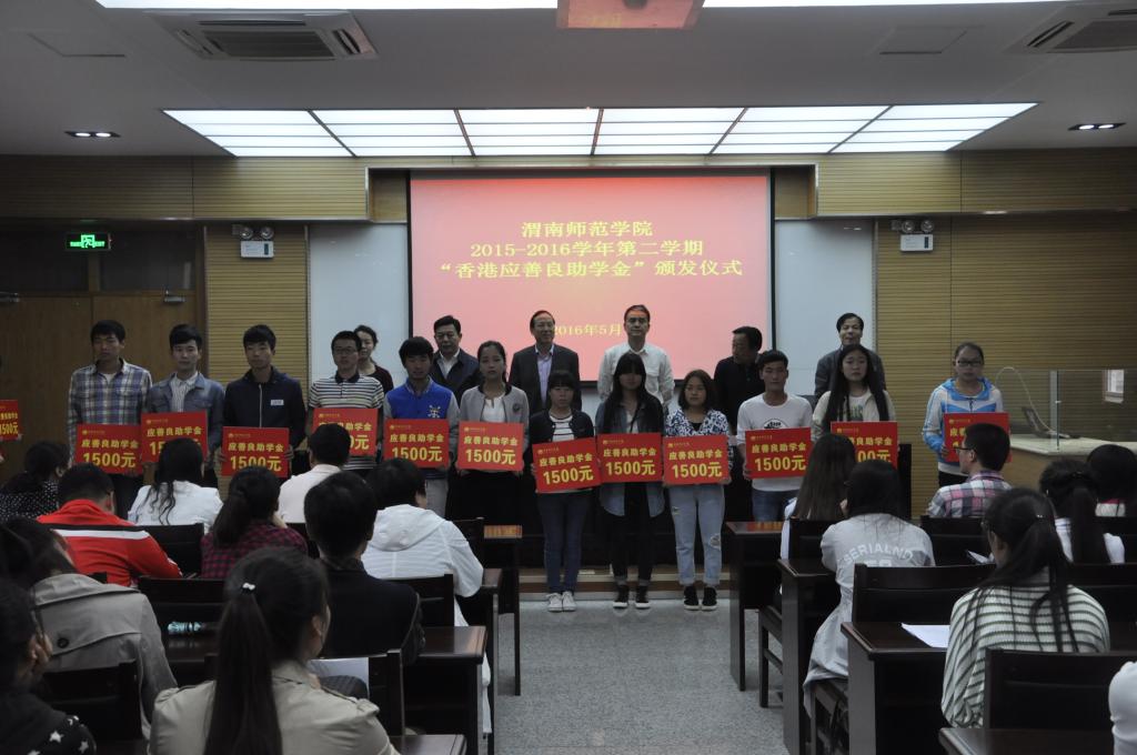 5月27日下午,学校在科学大讲堂举行2015-2016学年第二学期“香港应善良助学金”颁发仪式。陕西省人民政府侨务办公室副调研员张海涛、渭南市人民政府侨务办公室主任、渭南市侨联主席刘建军、best365党委委员杨小渭出席仪式,学工部领导及各二级学院学工办主任、负责学生资助工作的教师及120位受助学生参加了颁发仪式,仪式由学工部部长王俊安主持。