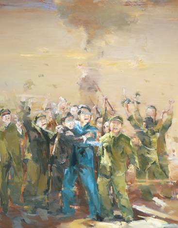 “两弹一星精神”代表作品《历史瞬间》,以意象表现的手法反映中国第一颗原子弹爆炸成功后研发人员喜悦的情景,表达了“热爱祖国、无私奉献,自力更生、艰苦奋斗,大力协同、勇于攀登”的两弹一星精神内涵。