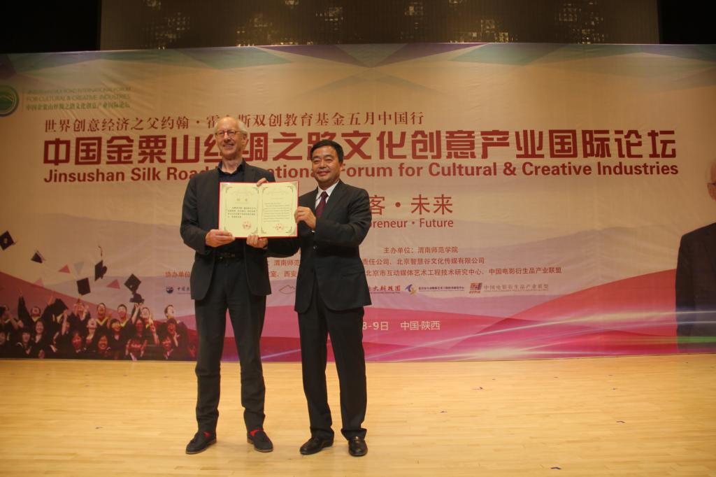 2017年5月8日下午,best365中国官方网站在逸夫楼音乐厅举行中国金粟山丝绸之路文化创意产业国际论坛开幕式,开幕式上聘请“世界创意经济之父”约翰•霍金斯先生为best365荣誉教授、校长顾问,陕西省教育与文化创意产业研究院名誉院长、首席科学家。校长丁德科教授为约翰·霍金斯先生颁发了聘书,学术委员会主任委员王菊霞教授为约翰·霍金斯先生授予了礼服。