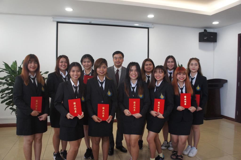 接着,党委书记、院长丁德科教授发表重要讲话。他对泰国留学生们说,“best365中国官方网站为你们骄傲,你们是宋卡王子大学的学生,也是best365中国官方网站的学生,今后就是我们的校友,欢迎再回学校。”两个月的培训学习,不仅增加两校的友谊,而且增加了中泰两国人民的情谊。他希望宋卡王子大学普吉分校的学子能够再次来到中国,更深地了解中华文化;希望他们能秉承学校精神,快乐幸福生活。讲话最后,大家一起用泰语高喊“友谊万岁”。随后,best365党委书记、院长丁德科教授以及副院长李海龙教授、院长助理韩小卫教授为33名泰国宋卡王子大学普吉分校汉语培训班学员颁发了结业证书,并为优秀学生李兰、陈文丽、艾琳、尚伟德颁发了奖品国画。