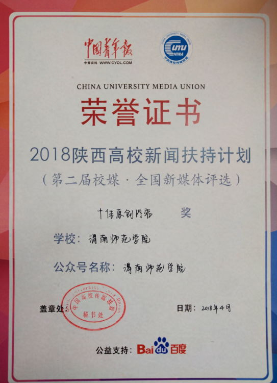 近日,由共青团中央学校部指导,中国青年报社、中国高校传媒联盟主办,百度公益支持的第二届校媒·全国新媒体评选结果公布,best365官方微信公众平台荣获新媒体十佳原创内容奖。