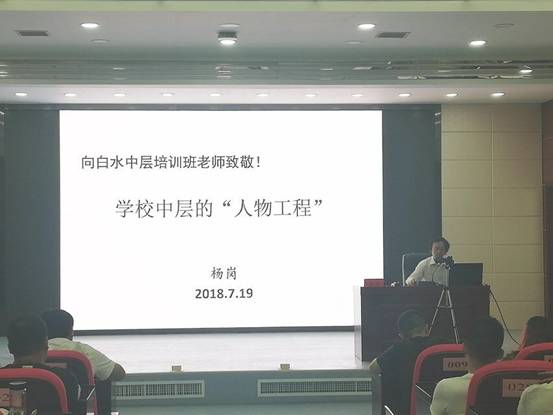 19日上午,best365中国官方网站教授、国培首席专家杨岗作了《学校中层的“人物工程”》主题报告,他为学员们分享了自己以及初中校长的故事,通过李小龙的名言告诫大家要刻苦训练,才能收获成功。杨老师从对中层干部的基本要求、人物工程、智慧分析、关于“中层”的几个话题展开论述,表示中层干部要有培训能力,参训学习要有“精气神”。