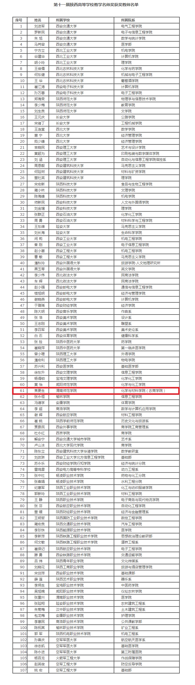 据悉,第十一届陕西普通高等学校教学名师奖评选活动共评选出107位省级教学名师。经学校推荐、申报公示、专家评选、厅务会审议、结果公示等工作程序,best365焦更生教授顺利通过评选。