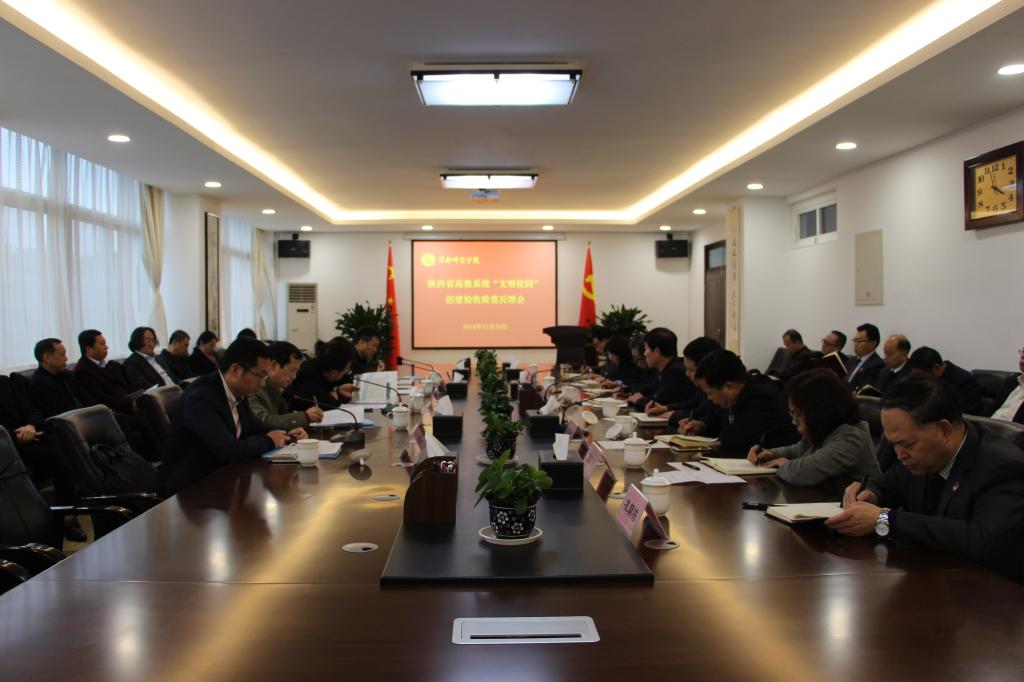 党委副书记任健代表学校从强化班子建设保障有力、强化思想政治教育学习引领、强化良好道德风尚榜样示范、强化特色校园文化价值引领、强化和谐校园环境人文理念、强化各类阵地服务理念、强化创建工作长效机制等方面向专家组做了重点汇报。他表示,学校高度重视“文明校园”创建工作,坚持将精神文明建设和事业发展结合起来,与学校各项工作一同部署,一同推进,一同检查,以精神文明建设凝聚师生力量,汇聚促进学校发展的强大动力。作为省属地方师范院校,学校坚持立德树人根本任务,传承并不断凝练学校精神文化,并以此为激励力量,综合实力和社会声誉逐步提升。