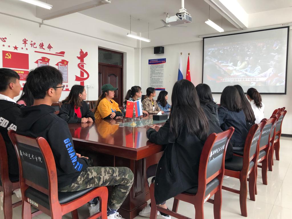 莫斯科艺术学院组织青年学生代表在会议室集中收看