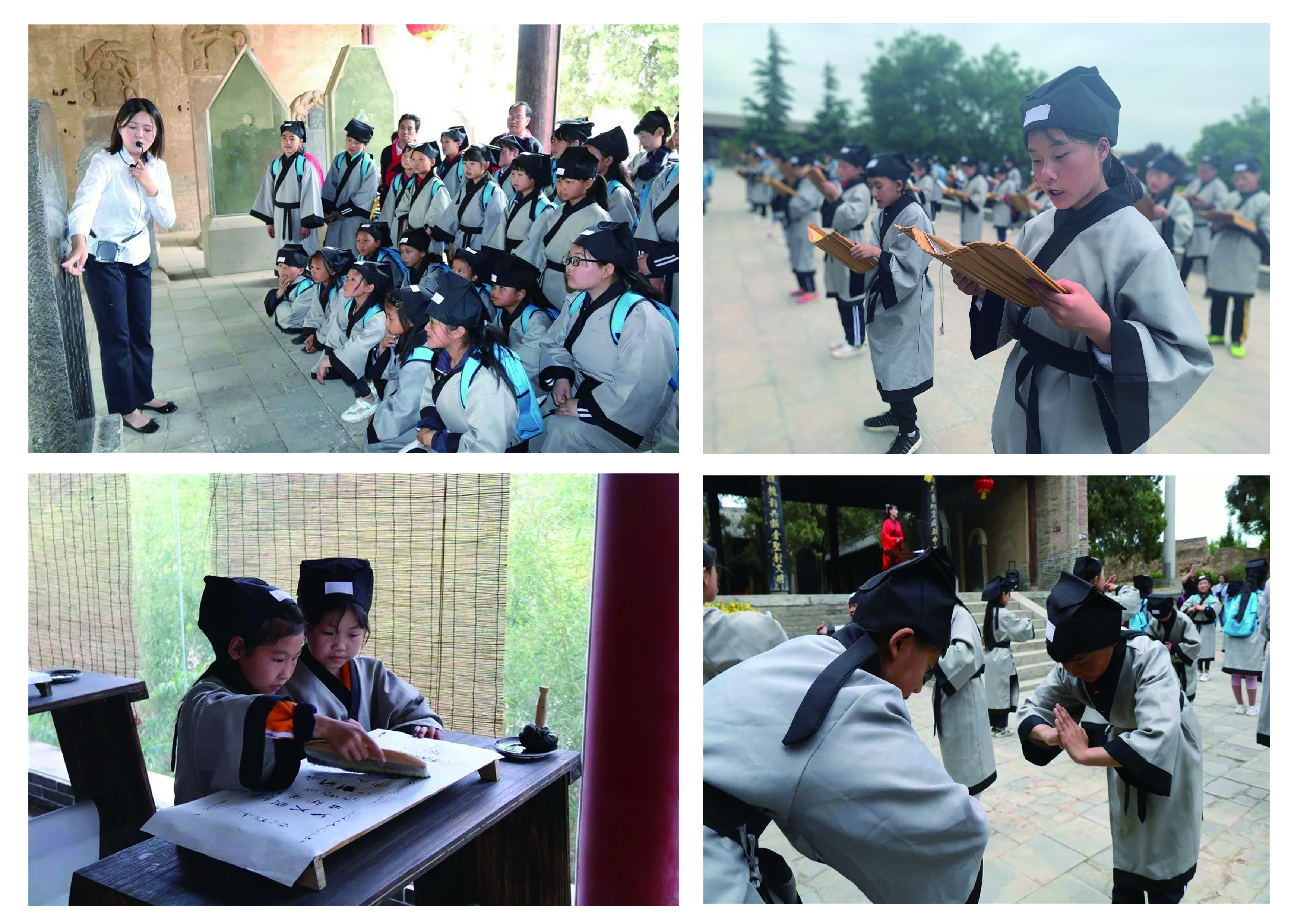 随后,学生们参观了仓颉庙,进行了习礼仪、写汉字和体验古法雕版印刷等活动。在写汉字和习汉礼活动中,将课堂所学知识,应用到了本次文化体验活动中。学生们认真练习了毛笔的握法及毛笔字的写法,在礼仪老师的带领下,学习了传统礼仪文化,练习了行拜师礼、男子礼及女子礼。参观结束后,学生们在中华汉字展馆前一起诵读了《弟子规》,深刻地体会了《弟子规》里教给人们的为人处事规范。