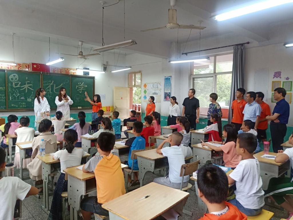 在三张镇中心小学,化学与材料学院团总支书记张小苗、团队负责人苟婕同学分别介绍了“彩虹之约”支教团队开展“爱心陪伴为梦想助跑”特色实践活动的基本情况及课程安排。支教团队连续六年开展暑期三下乡特色支教活动,今年他们将中国传统文化和爱国主义教育结合起来,设计参观渭华起义纪念馆、爱国诗歌朗诵、红歌学唱、书法课、手工制作国旗等特色活动,为留守儿童送去关爱的同时,在他们心中厚植爱国情怀。任书记一行还进入教室观摩了生动的趣味化学课。