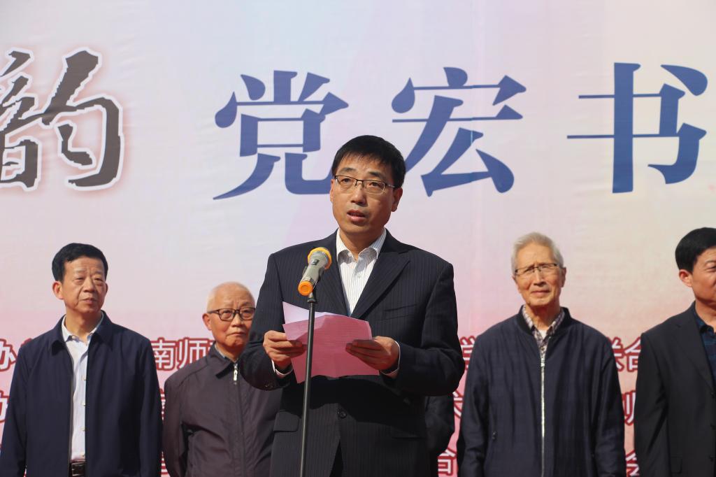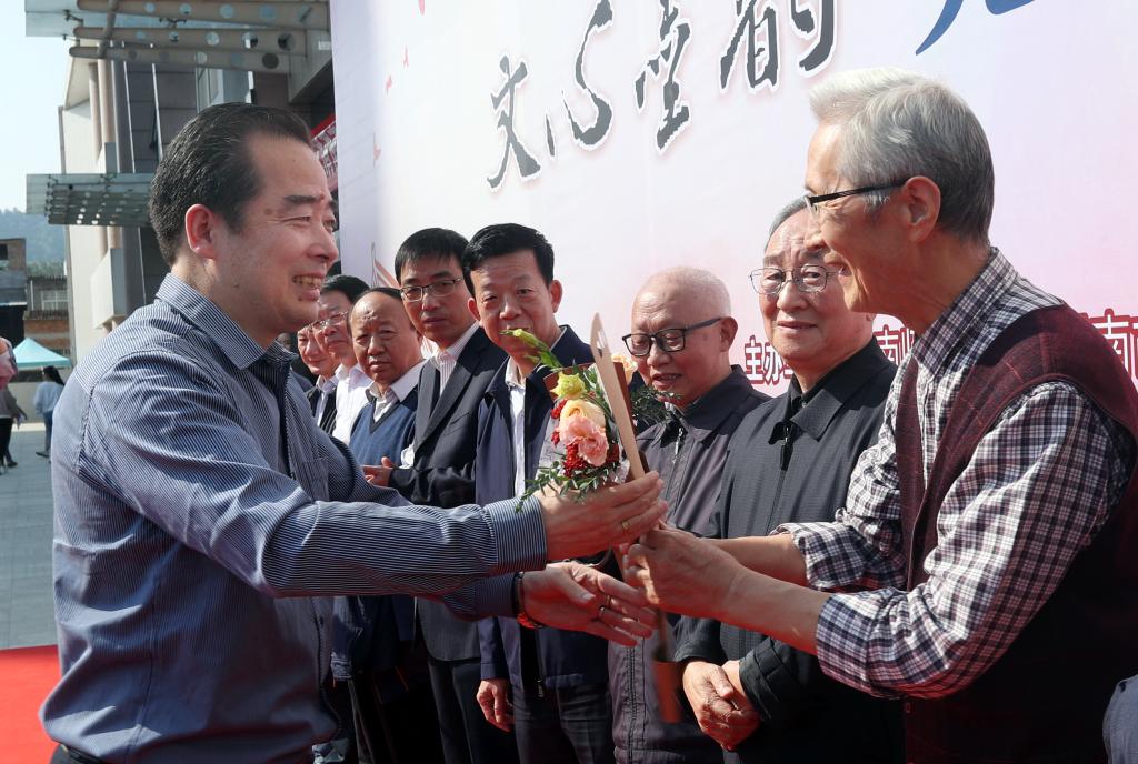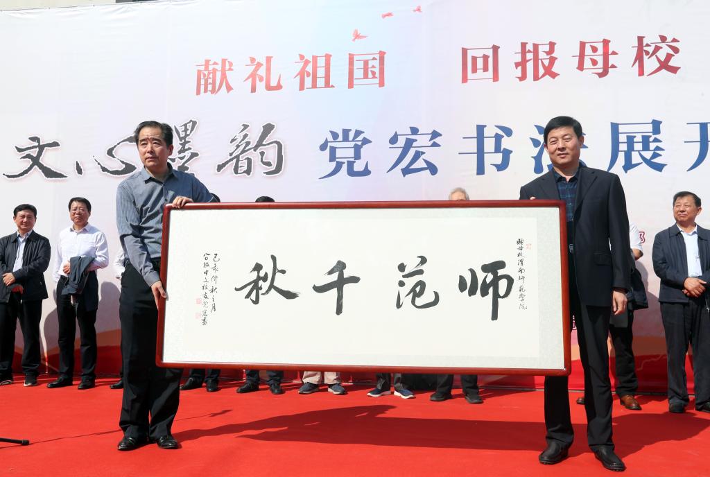 开幕式结束前,党宏校友发表了源自肺腑的感恩发言,并深情地向母校赠送了“师范千秋”匾额,向恩师雷德志、段国超两位教授赠送了鲜花。美术学院在校生代表在向党宏学长敬献鲜花时表示要以优秀校友为榜样,不忘初心,求索上进,报效国家。
