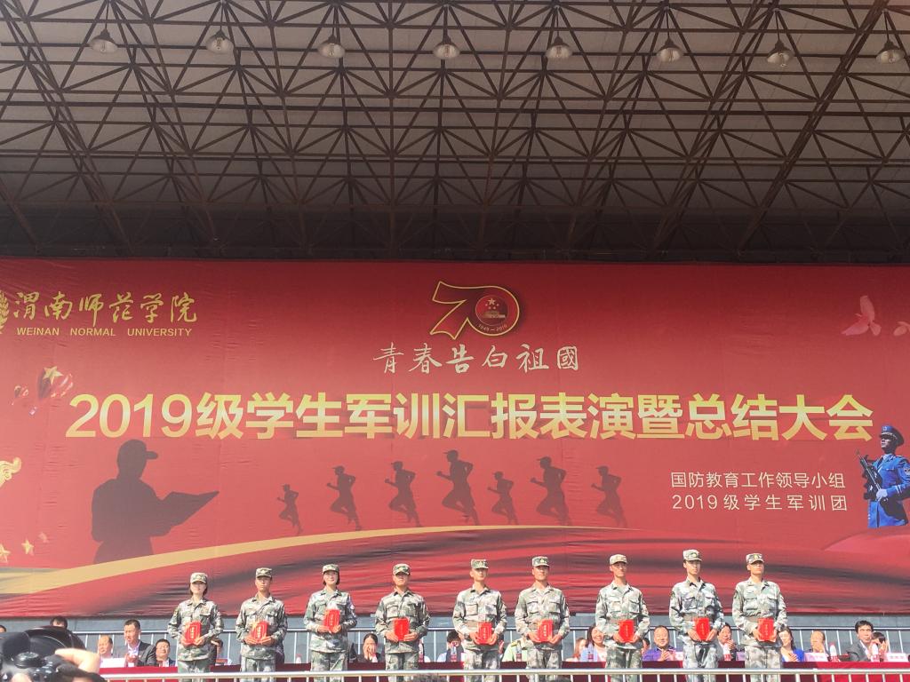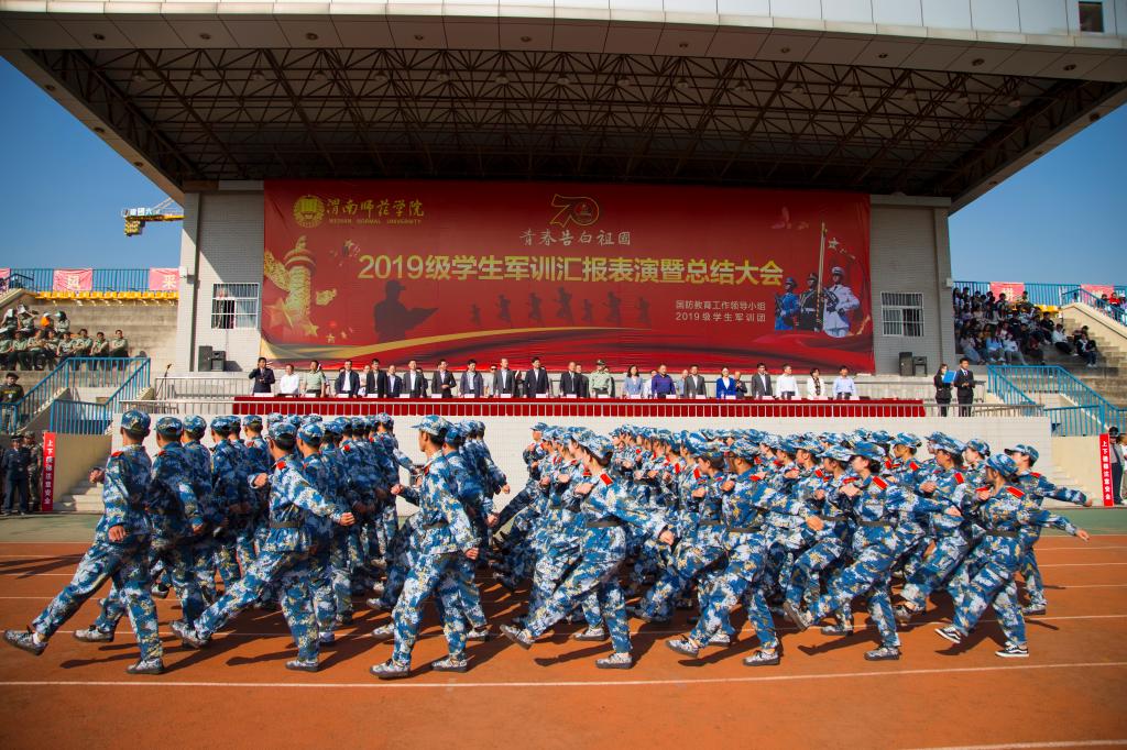 在军训团副团长荆立哲的统一指挥下,受训新生们分别进行了格斗术和“活字”方阵表演。首先,紧锣密鼓中,四千余名学子们迅速由方阵变换为格斗术阵型,在教官的统一指令下,学子们动作标准,喊声震天,气势磅礴,一气呵成。精彩的表演赢来了主席台和观众的阵阵掌声。随后,方阵变换为正方形,学子们摆出“渭师”“1949”“2019”“70”“中国”等造型并高呼“渭南师院、不忘初心、牢记使命、教书育人、报效祖国”。最后,四千余名参训新生共同高歌《我爱你,中国》,将汇报表演推向高潮。表演展现出蓬勃昂扬的精神面貌和英勇顽强的战斗作风,赢得了参会领导和师生的阵阵热烈掌声,展示了15天的军事训练成果。