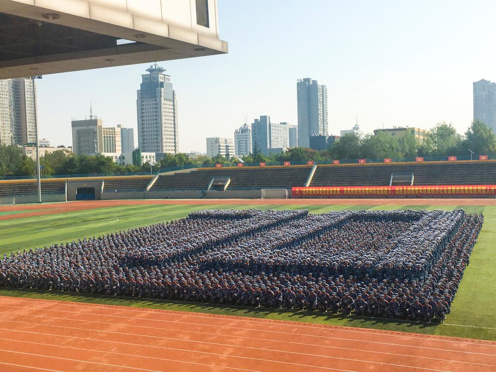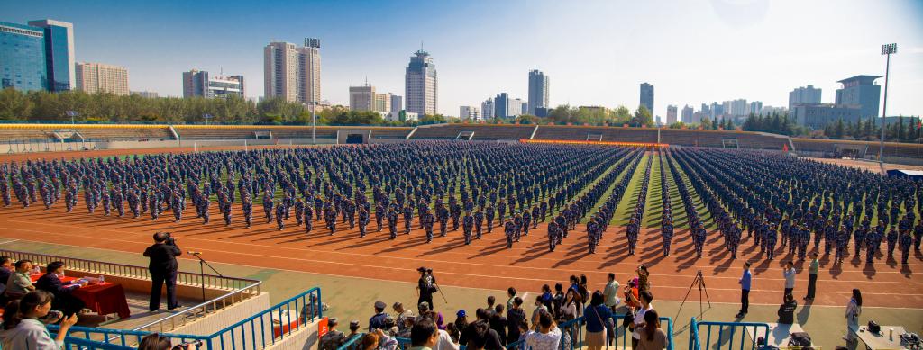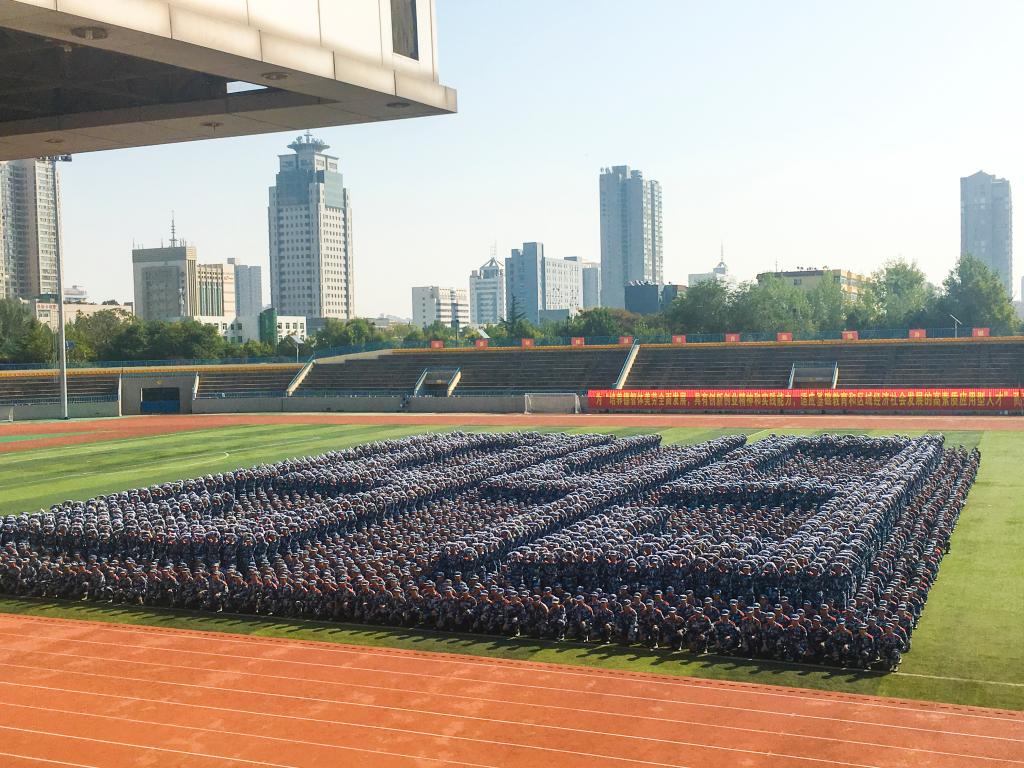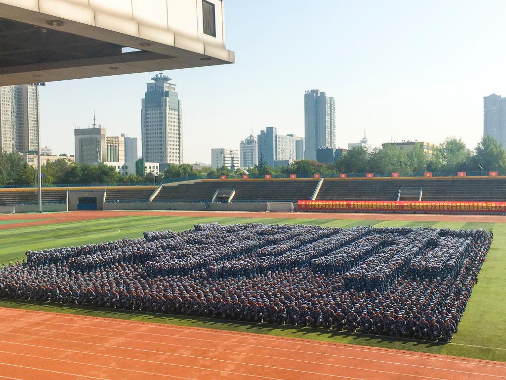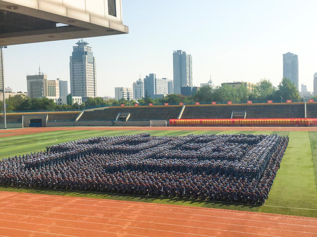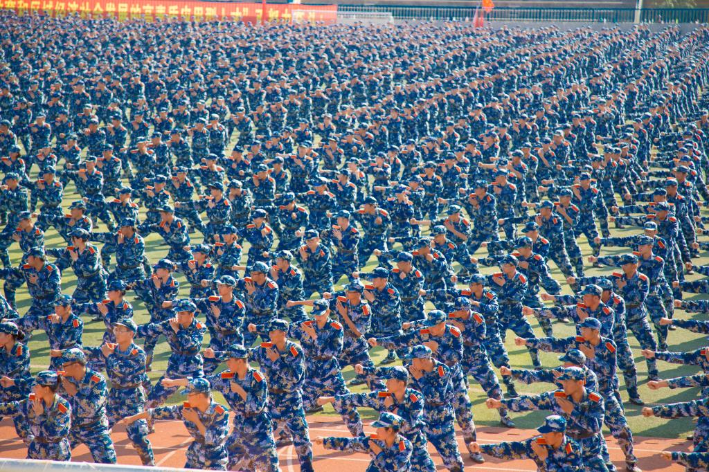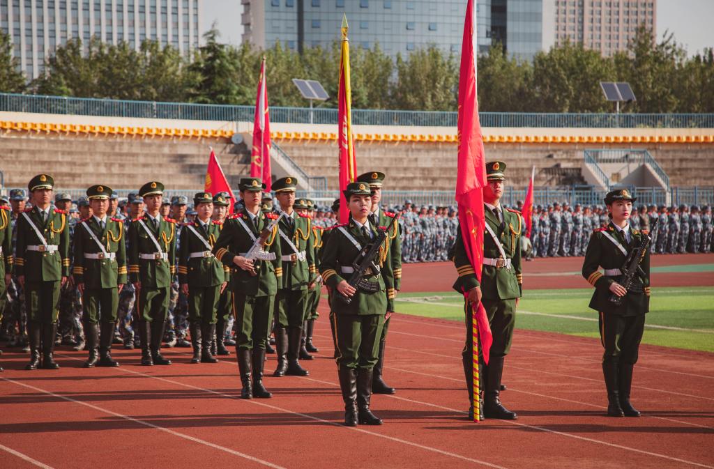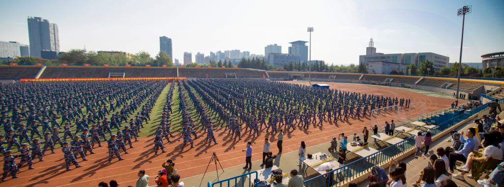大会在雄壮的国歌声中拉开序幕。随后,伴随着解放军进行曲,分列式开始。田径运动场上4094名参训新生精神抖擞、步伐整齐地依次走过主席台接受检阅。队列方阵动作整齐划一,步伐矫健有力,展现了新时代大学生昂扬向上、拼搏进取的青春风采。
