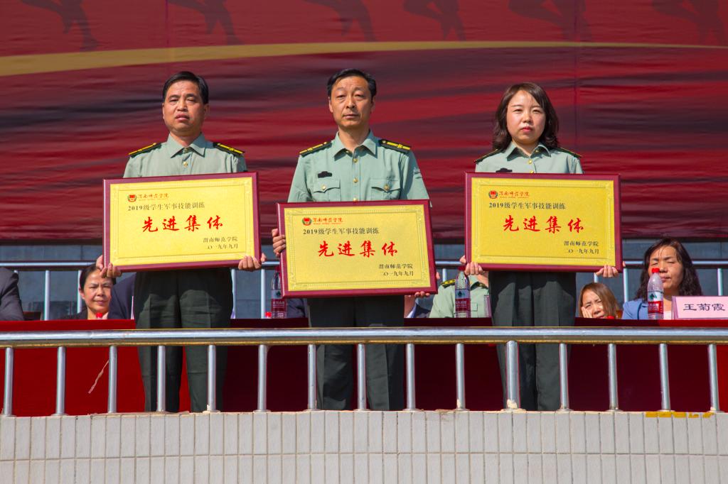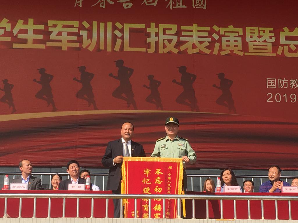 会上,军训团政委崔启宣读了《关于表彰2019级学生军训工作先进集体、先进连队及先进个人的决定》。与会领导分别为受表彰单位、连队及个人颁奖。最后,校长赵曼向中国人民解放军63776部队赠送锦旗。