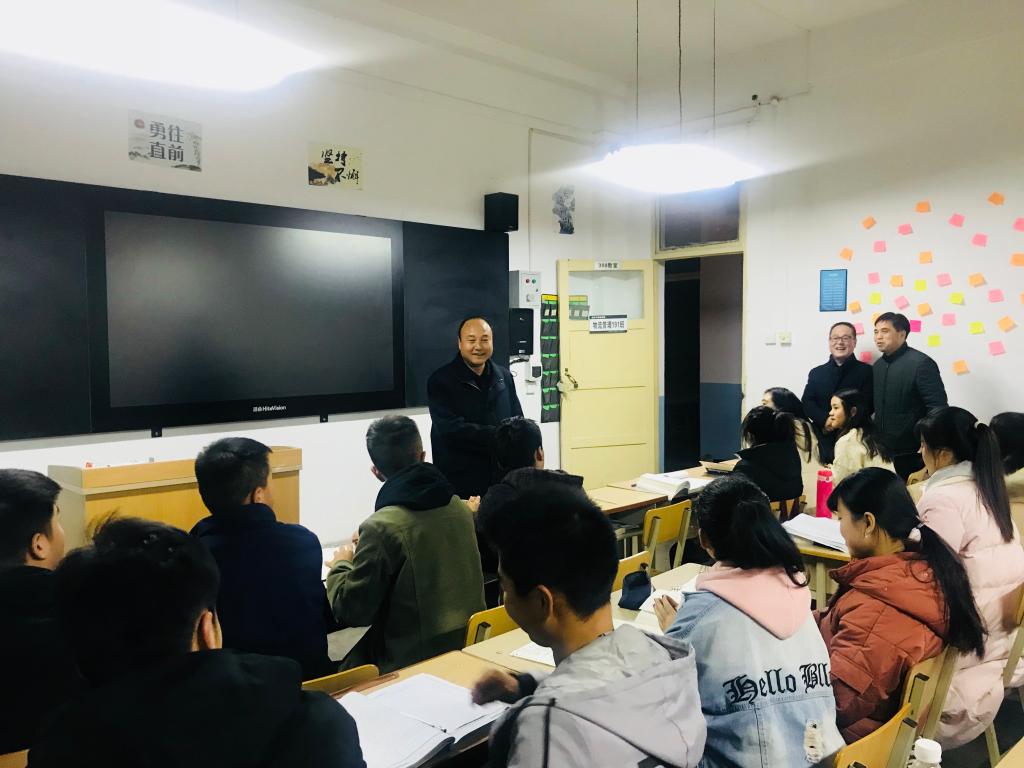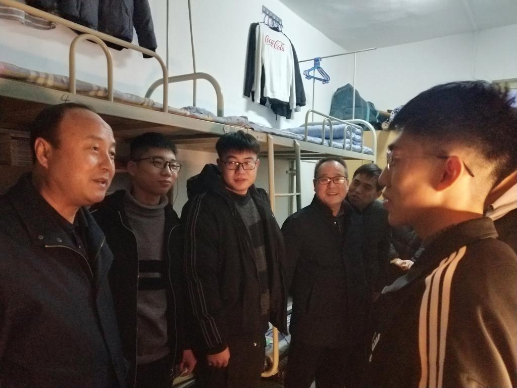 12月12日晚,校长赵曼在经济与管理学院党总支书记魏光民、副书记李武军及西岳校区辅导员等陪同下,来到西岳校区看望经管学院2019级学生。赵校长一行先后深入学生公寓、餐厅、教室、教师休息室、辅导员办公室、辅导员值班室、后勤服务中心值班室、西岳校区学生活动礼堂等处,看望师生和值班人员。