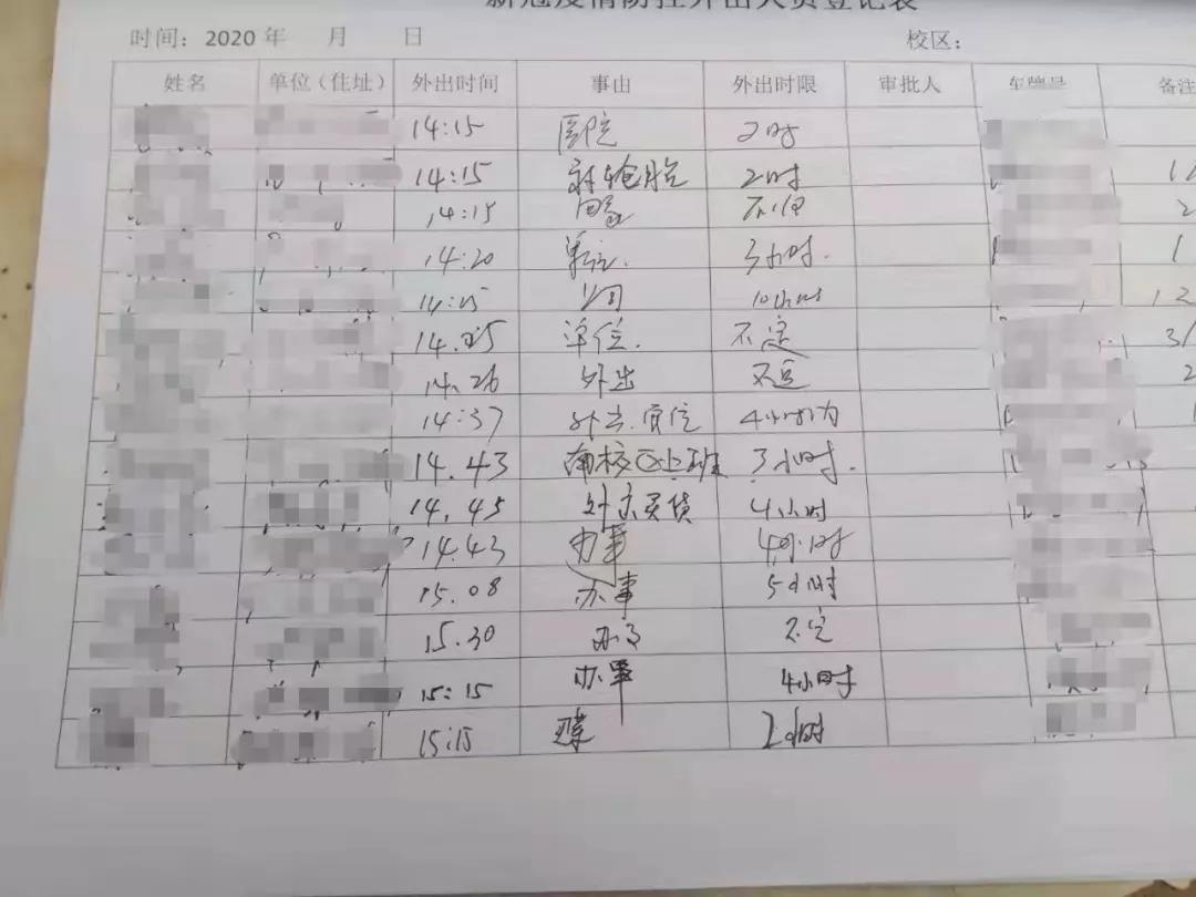 学校印制了外出人员和车辆登记表,倡议非特殊情况不要外出,对确需外出人员和车辆的外出时间、事由、时限等信息严格登记。对外出超过4小时以上者由各单位和保卫处进行报备审批,非本单位职工及家属由社区报备审批。进一步加强了防控力量配备,三个校区除值班保安外,各配备一名保卫处职工参与防控,朝阳校区压力较大,保卫处副处长带队加强防控力度。