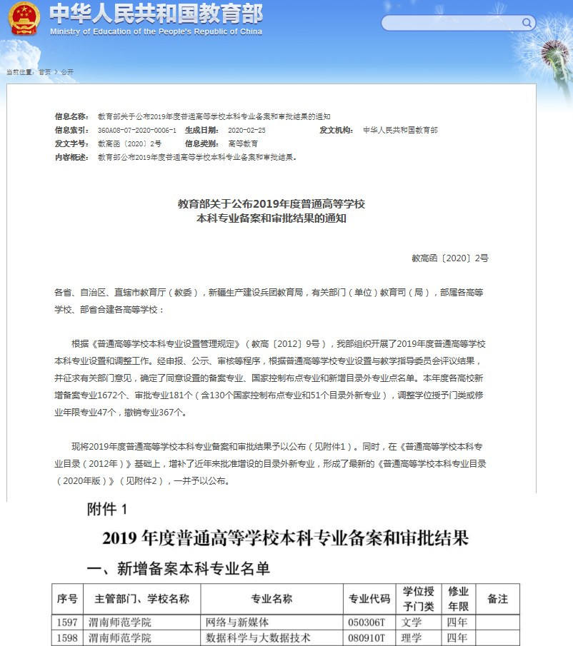 日前,教育部公布了2019年度普通高等学校本科专业备案和审批结果。经申报、公示、审核等程序,根据普通高等学校专业设置与教学指导委员会评议结果,并征求有关部门意见,确定了同意设置的备案专业、国家控制布点专业和新增目录外专业点名单。best365申报的“网络与新媒体”“数据科学与大数据技术”两个本科专业获得教育部批准备案。