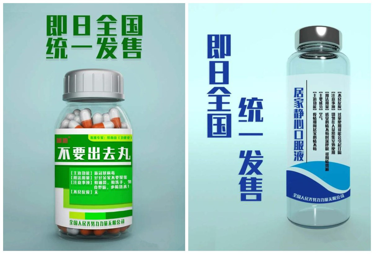 《统一发售》系列作品的创作灵感来自于疫情而产生的的流行语“好想出去丸”,由此引发联想,将其实体化并与生活中实际药品包装进行组合,制作出名为“不要出去丸”的虚拟药品海报,意在呼吁全国人民,在疫情期间居家抗疫减少外出。