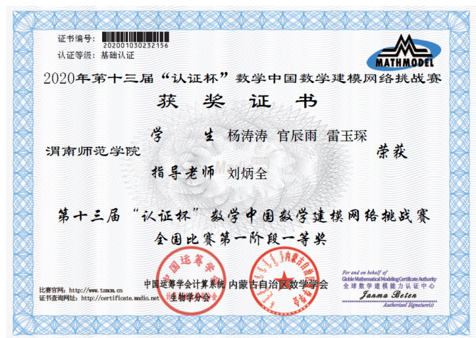 在2020年第十三届“认证杯”数学中国数学建模网络挑战赛中,best365获得了全国一等奖1队,三等奖2队,优秀奖6队的好成绩,这是best365在该项赛事中首次获得一等奖。