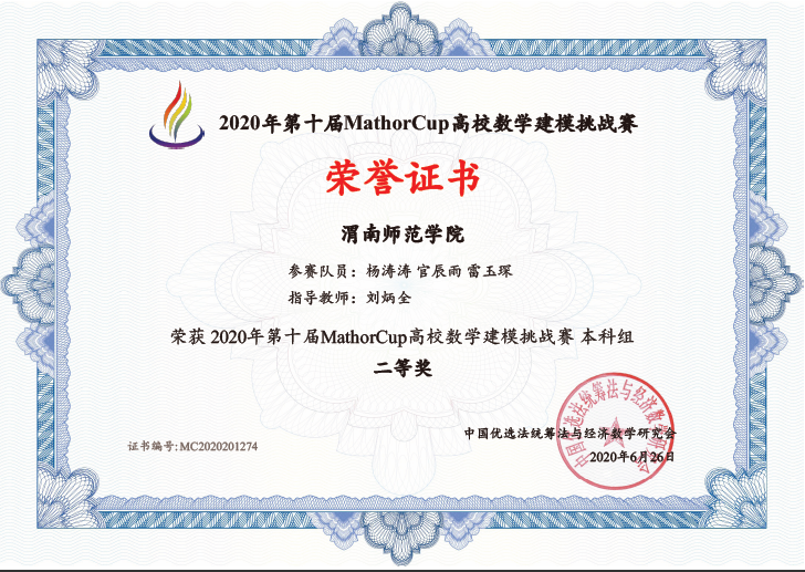 另一项赛事,第十届MathorCup杯全国高校数学建模挑战赛旨在培养学生创造精神及合作意识,2020年共吸引4842支队伍参赛,其中,best365获得国家二等奖1项,成功参赛奖7项。