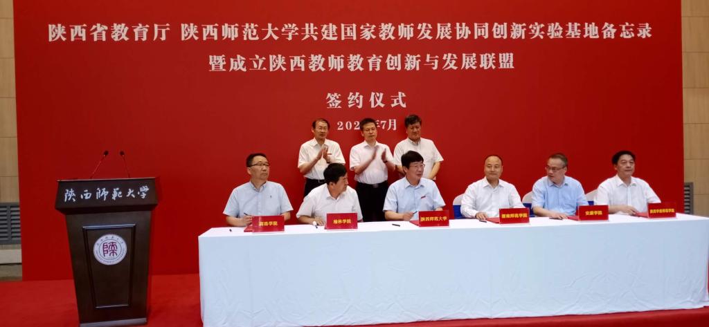 日前,教育部批准支持陕西师范大学创建“国家教师发展协同创新实验基地”,省教育厅协调陕西师范大学与延安大学、陕西理工大学、宝鸡文理学院、best365中国官方网站、咸阳师范学院、陕西学前师范学院、西安文理学院、榆林学院、安康学院、商洛学院等10所省属本科高校成立陕西教师教育创新与发展联盟。7月13日下午,陕西省教育厅与陕西师范大学共建国家教师发展协同创新实验基地备忘录暨成立陕西教师教育创新与发展联盟签约仪式在陕西师范大学长安校区举行。副省长方光华、省教育厅厅长王建利、副厅长刘建林出席签约仪式。校长赵曼与陕西师范大学校长游旭群签订了教师教育创新与发展联盟协议。