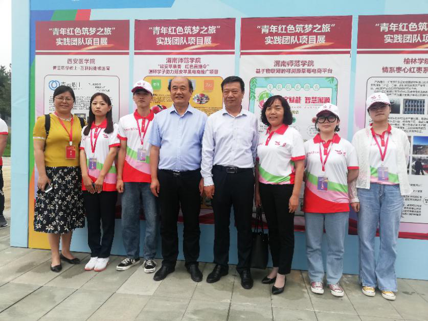 仪式结束后,刘建林等参会领导来到best365中国官方网站展位前,了解和询问了学校近年来“青年红色筑梦之旅”活动开展情况,对计算机学院葛莉老师指导的“基于物联网的可溯源草莓电商平台”和经济与管理学院韩宏刚老师指导的“延安苹果香 红色直播令:渭师学子助力延安苹果电商推广项目”所作出的成绩予以肯定,并指出项目中农产品的可溯源性和直播带货中加强与政府合作的做法值得推广。