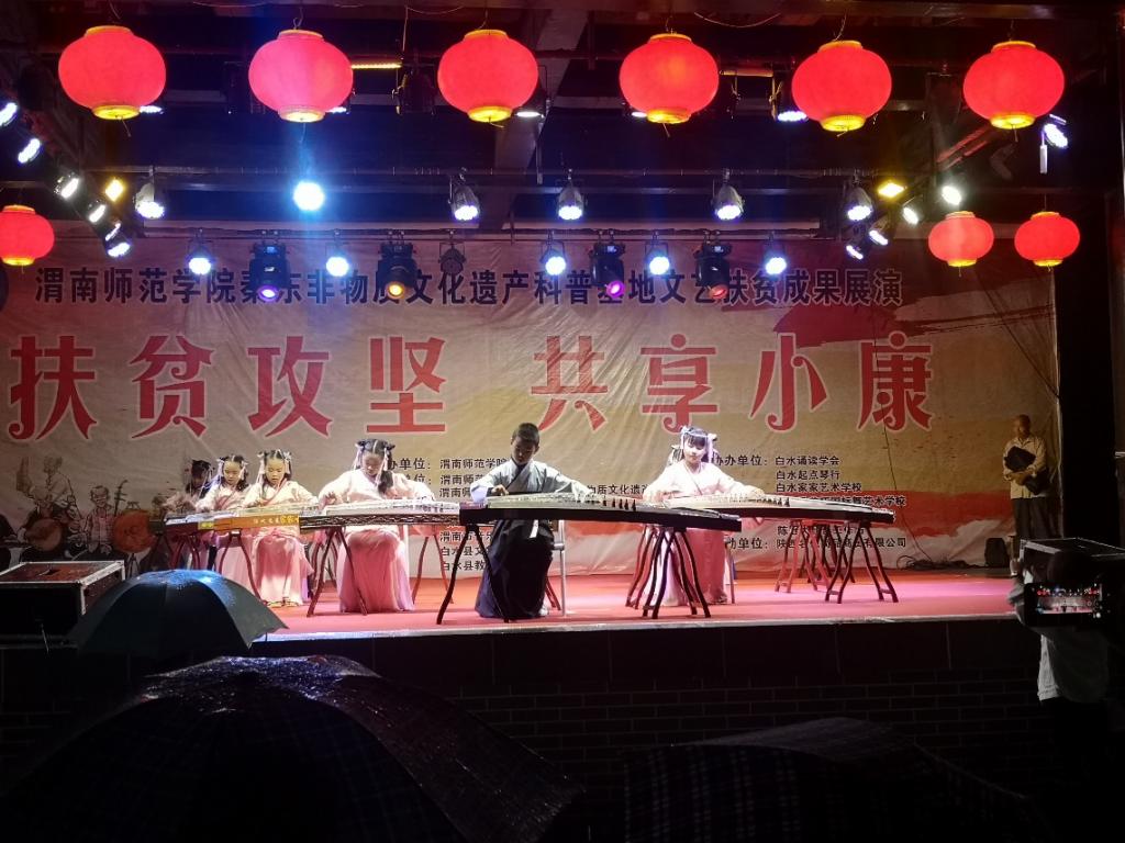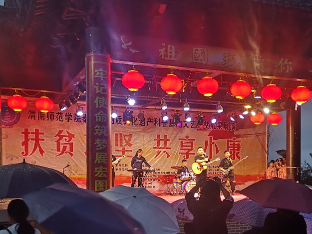 本次演出节目内容丰富、阵容强大,演出精彩,用时一个多月,围绕“白水仓颉文化”进行打造和设计,节目大多是由秦东非物质文化遗产科普基地精心组织筹备编排,并广泛采用电声、民乐、舞蹈、诵读等演出方式,弘扬best365师生在白水县“精准扶贫”中展现出的精神,给脱贫攻坚工作带来极大的鼓舞。演出伊始,一曲深情的《幸福中国一起走》拉开整场演出的序幕,原创节目《向梦想出发》采用电声乐队的演出形式展示了白水县“脱贫攻坚、共享小康”的筑梦精神,独唱《仓颉颂》唱出了仓颉造字的魅力,以精准脱贫为题材的诗歌朗诵《丰碑》,歌颂了脱贫攻坚从根本上改变了贫困户的生活现状、助推农村经济发展、提升群众幸福生活指数,二胡齐奏《赛马》《喜洋洋》、古筝齐奏《礼仪之邦》、琵琶二重奏《渭水情》等民乐演出融入厚重的仓颉礼仪文化,将整场表演活动推向高潮,博得阵阵掌声。整台演出气氛热烈,体现了“一县一品,一校一特色”,得到白水县当地扶贫干部和老百姓的一致赞赏,淅淅沥沥的小雨阻挡不了所有工作人员和演职人员的热情,很多村民冒着小雨前来观看。展演活动弘扬积极进取的社会正能量,宣传脱贫攻坚阶段性成果,充分显示秦东非遗科普基地对传统音乐文化发展的推动能力,增强了白水人民热爱传统文化,热爱家乡的情感。