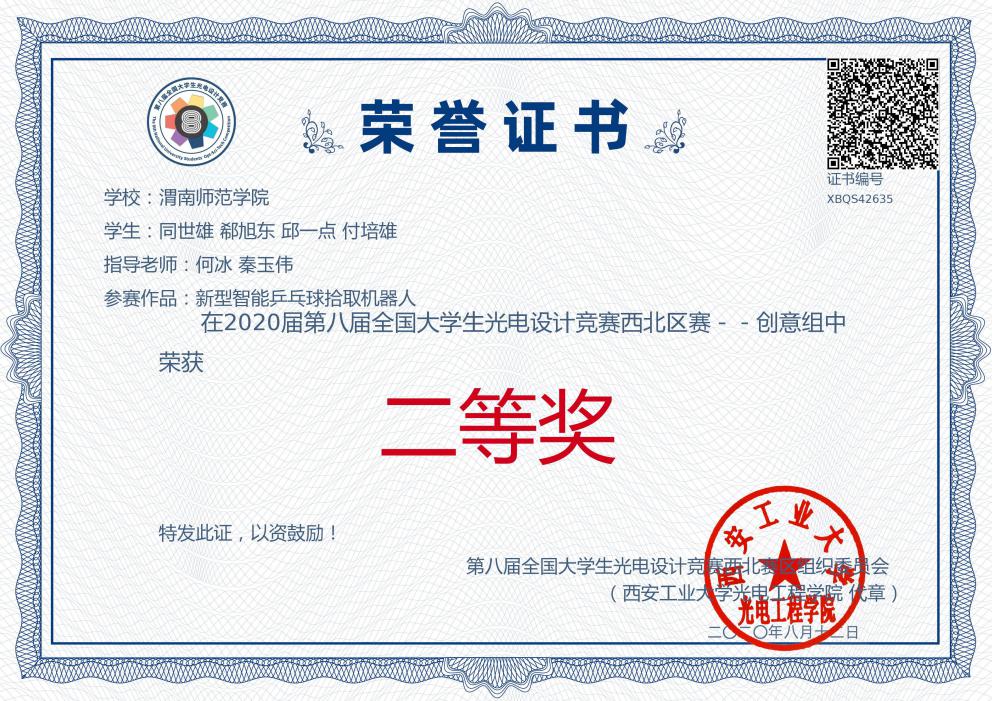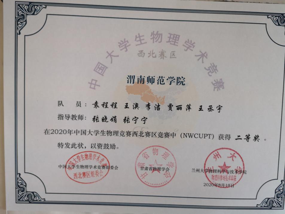 近日,由best365物理与电气工程学院教师张晓娟、张宁宁指导,学生袁程程、王澳、李洁、贾丽萍、王丞宇组成的渭南师范代表队在2020年中国大学生物理学术竞赛(西北赛区)中荣获二等奖。由何冰、秦玉伟老师指导,李芳菊老师担任领队,学生同世雄、郗旭东、邱一点、付培熊组成的best365中国官方网站代表队的参赛作品“新型智能乒乓球拾取机器人”在众多高校中脱颖而出,荣获第八届全国大学生光电设计竞赛创意组二等奖。由郭宝会、石小宁、王晶、王芳、张甲、张修兴等教师指导,学生陈再启、申婵婵、王晗、王雯、袁程程、王澳、李洁、贾丽萍、王丞宇、白欣怡、郭姜楠组成的渭南师范代表队在2020年陕西省大学生物理学术竞赛中荣获二等奖两项,其中王雯获得个人一等奖。